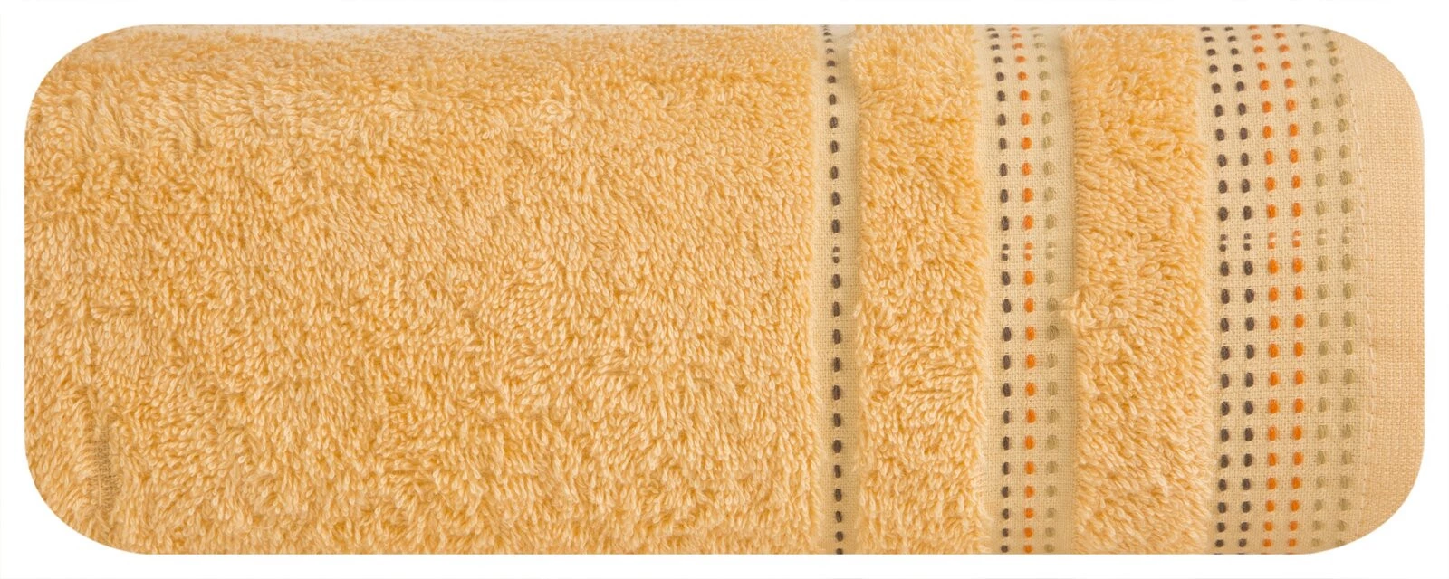 Jednobarwny ręcznik z miękkiej i chłonnej tkaniny bawełnianej o splocie frotte zdobiony kolorową bordiurą w stylu fastrygi. Łatwy w praniu, nie farbuje. szerokość: 30 cm, długość: 50 cm, kolor: jasnopomarańczowy, Gramatura: 500 GSM, Skład: 100% bawełna