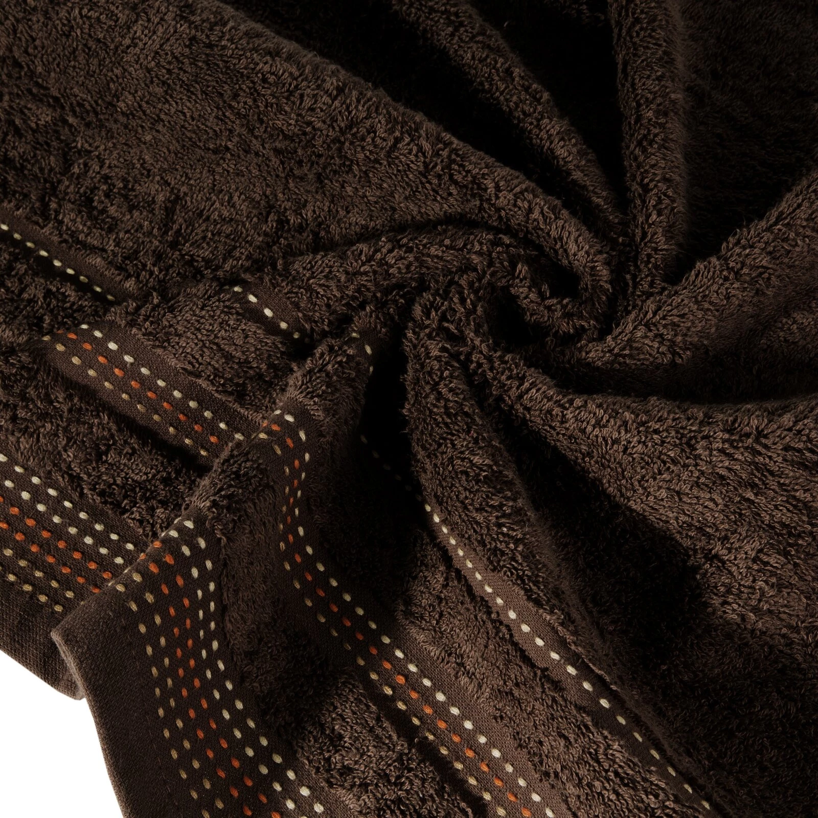 Jednobarwny ręcznik z miękkiej i chłonnej tkaniny bawełnianej o splocie frotte zdobiony kolorową bordiurą w stylu fastrygi. Łatwy w praniu, nie farbuje. szerokość: 50 cm, długość: 90 cm, kolor: brązowy, Gramatura: 500 GSM, Skład: 100% bawełna