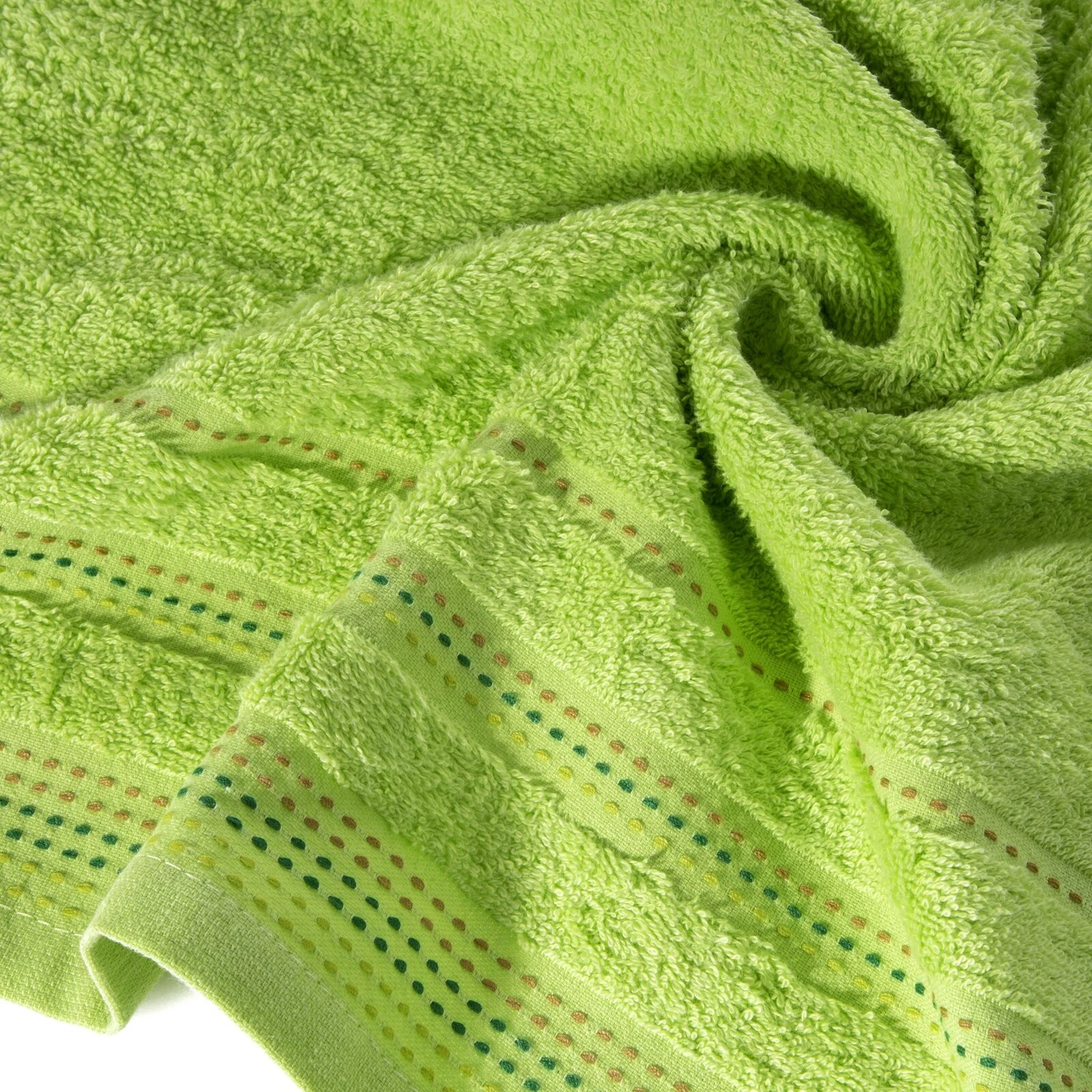 Jednobarwny ręcznik z miękkiej i chłonnej tkaniny bawełnianej o splocie frotte zdobiony kolorową bordiurą w stylu fastrygi. Łatwy w praniu, nie farbuje. szerokość: 70 cm, długość: 140 cm, kolor: jasnozielony, Gramatura: 500 GSM, Skład: 100% bawełna