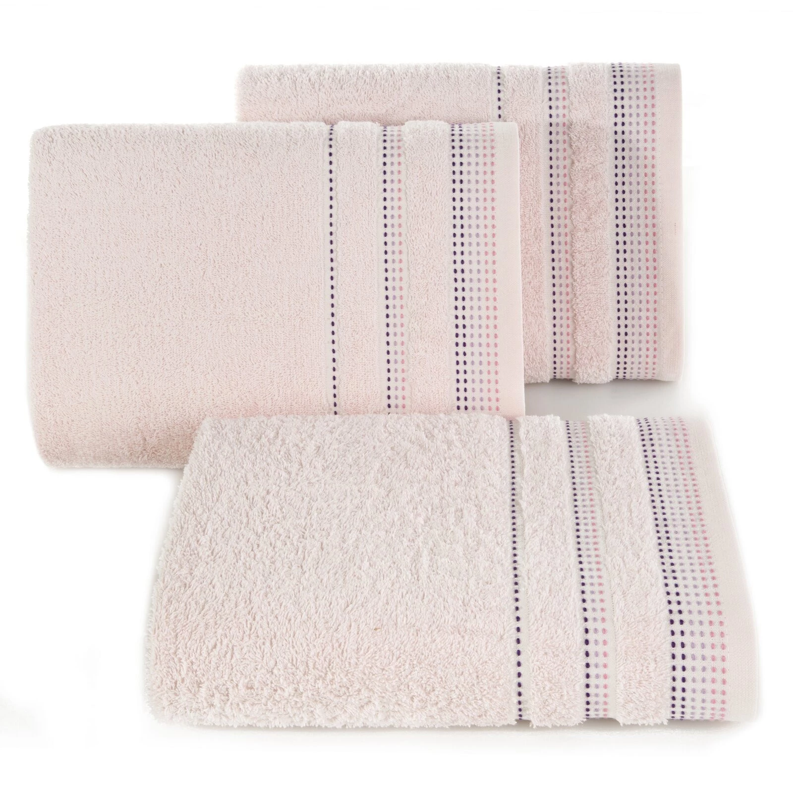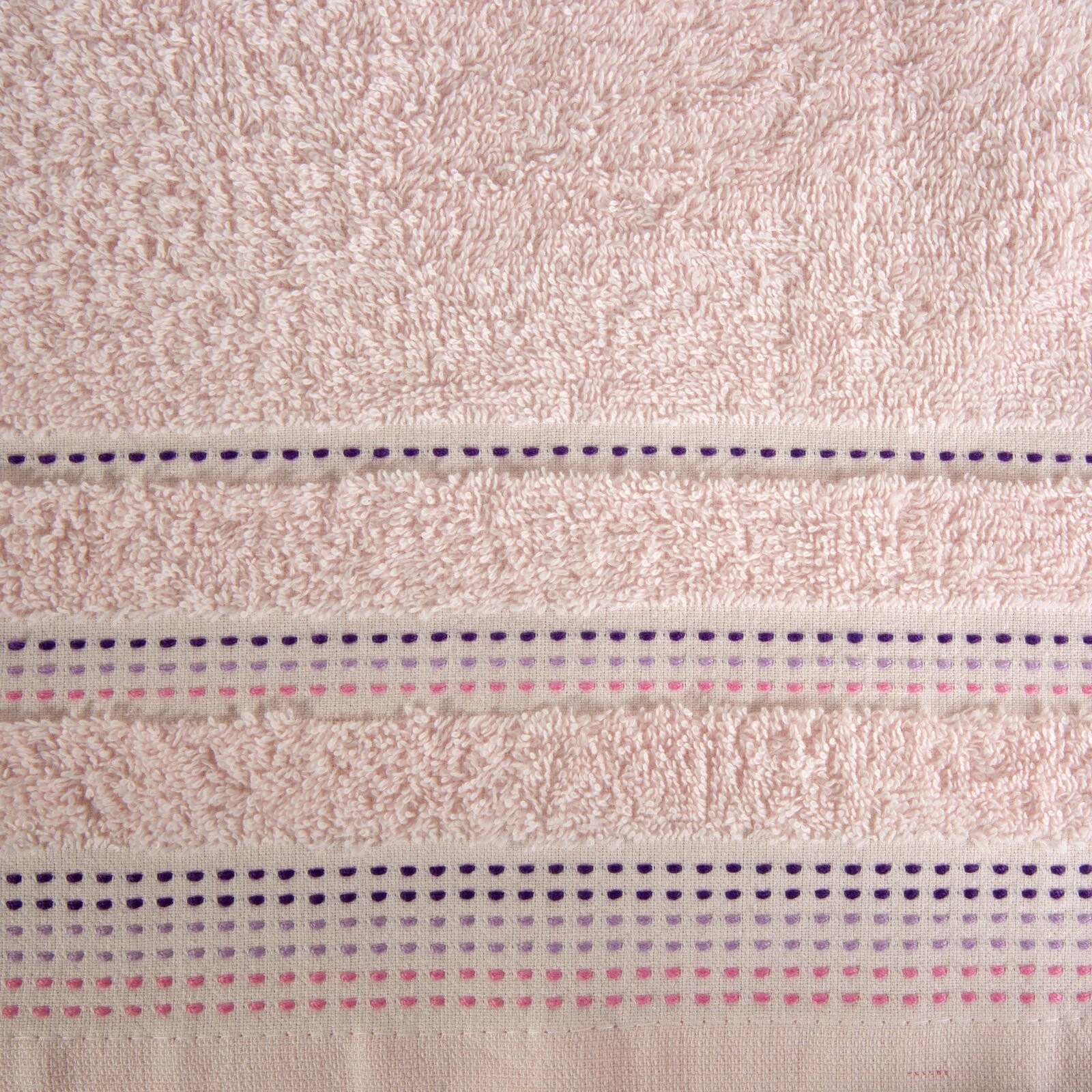 Jednobarwny ręcznik z miękkiej i chłonnej tkaniny bawełnianej o splocie frotte zdobiony kolorową bordiurą w stylu fastrygi. Łatwy w praniu, nie farbuje. szerokość: 50 cm, długość: 90 cm, kolor: różowy, Gramatura: 500 GSM, Skład: 100% bawełna