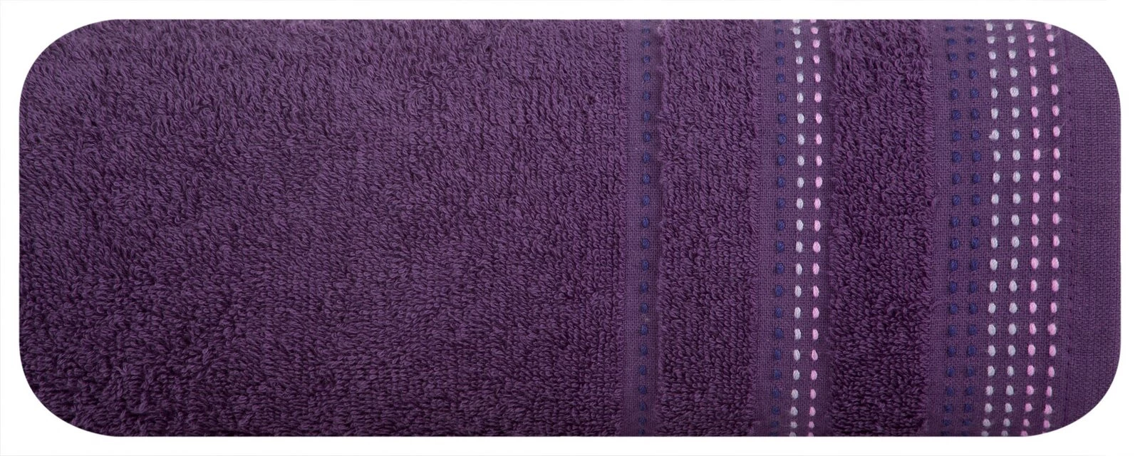 Jednobarwny ręcznik z miękkiej i chłonnej tkaniny bawełnianej o splocie frotte zdobiony kolorową bordiurą w stylu fastrygi. Łatwy w praniu, nie farbuje. szerokość: 30 cm, długość: 50 cm, kolor: fioletowy, Gramatura: 500 GSM, Skład: 100% bawełna