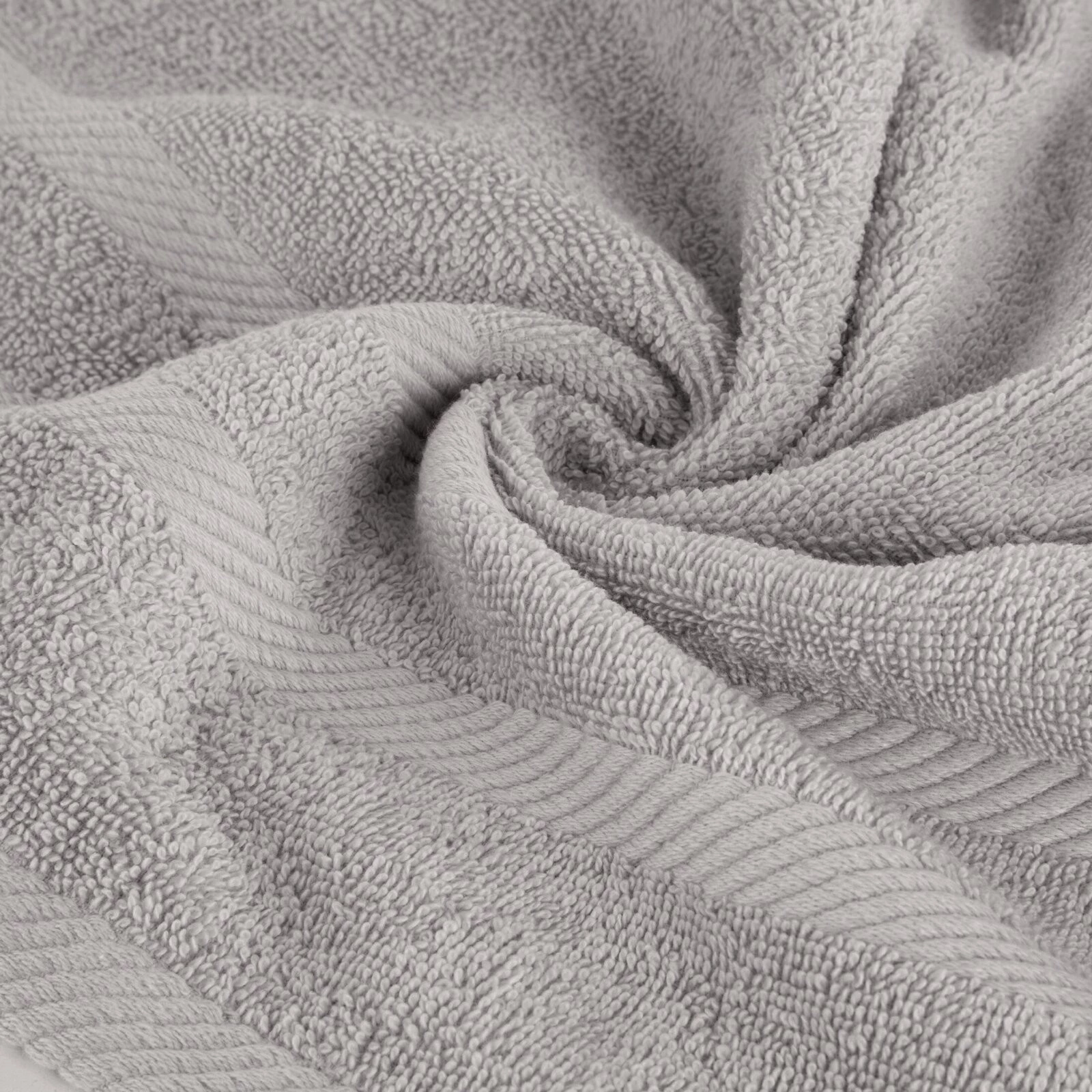 Jednobarwny ręcznik z miękkiej i chłonnej tkaniny bawełnianej o splocie frotte zdobiony kolorową bordiurą w stylu fastrygi. Łatwy w praniu, nie farbuje. szerokość: 100 cm, długość: 150 cm, kolor: srebrny, Gramatura: 500 GSM, Skład: 100% bawełna
