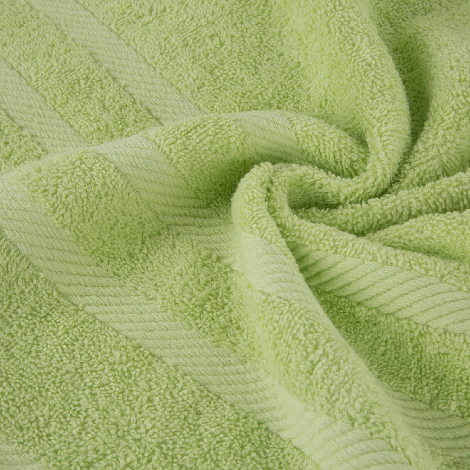 Jednobarwny ręcznik z miękkiej i chłonnej tkaniny bawełnianej o splocie frotte zdobiony kolorową bordiurą w stylu fastrygi. Łatwy w praniu, nie farbuje. szerokość: 100 cm, długość: 150 cm, kolor: jasnozielony, Gramatura: 500 GSM, Skład: 100% bawełna