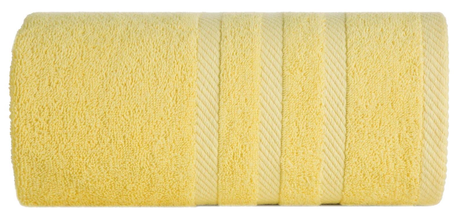 Jednobarwny ręcznik z miękkiej i chłonnej tkaniny bawełnianej o splocie frotte zdobiony kolorową bordiurą w stylu fastrygi. Łatwy w praniu, nie farbuje. szerokość: 100 cm, długość: 150 cm, kolor: żółty, Gramatura: 500 GSM, Skład: 100% bawełna