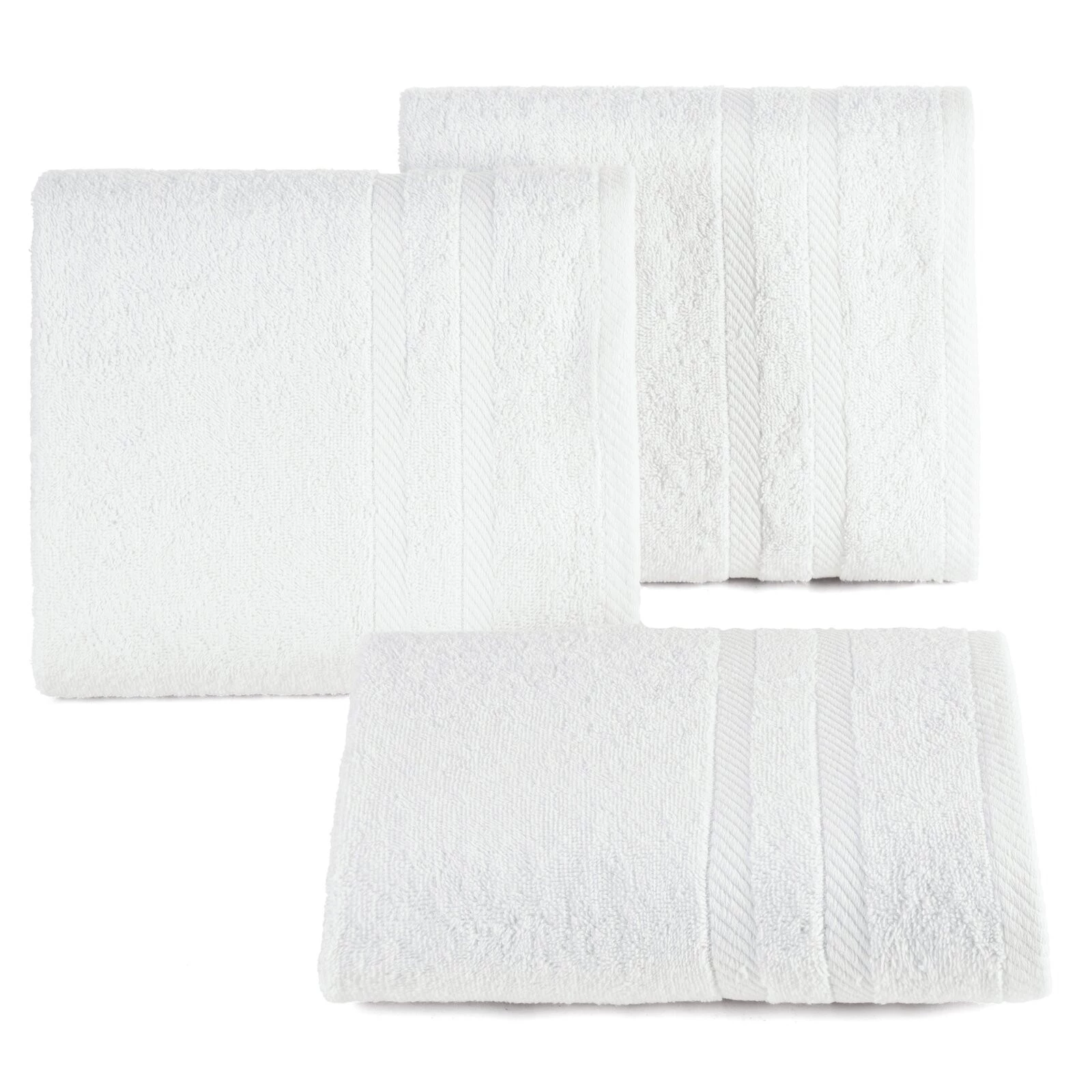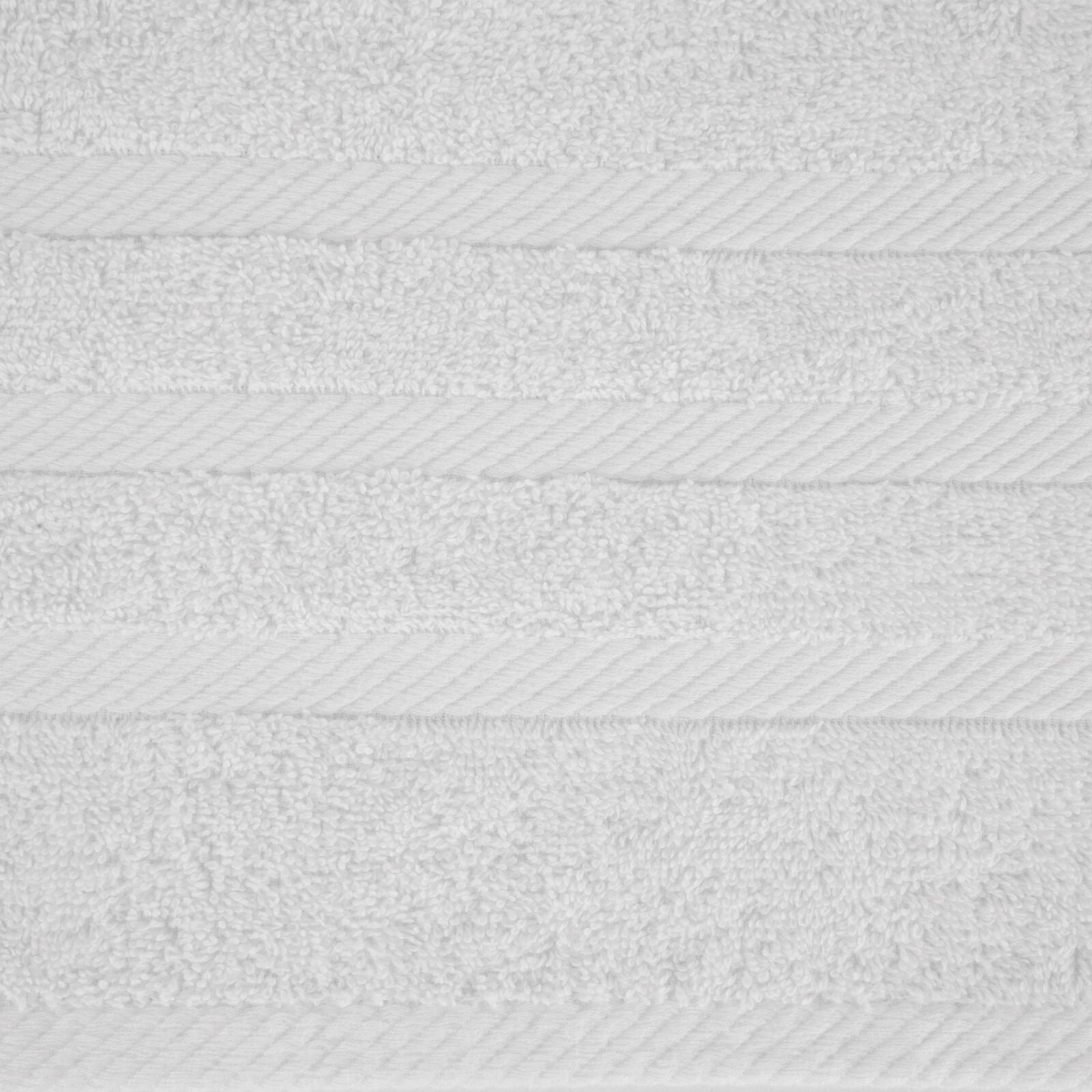 Jednobarwny ręcznik z miękkiej i chłonnej tkaniny bawełnianej o splocie frotte zdobiony kolorową bordiurą w stylu fastrygi. Łatwy w praniu, nie farbuje. szerokość: 100 cm, długość: 150 cm, kolor: biały, Gramatura: 500 GSM, Skład: 100% bawełna