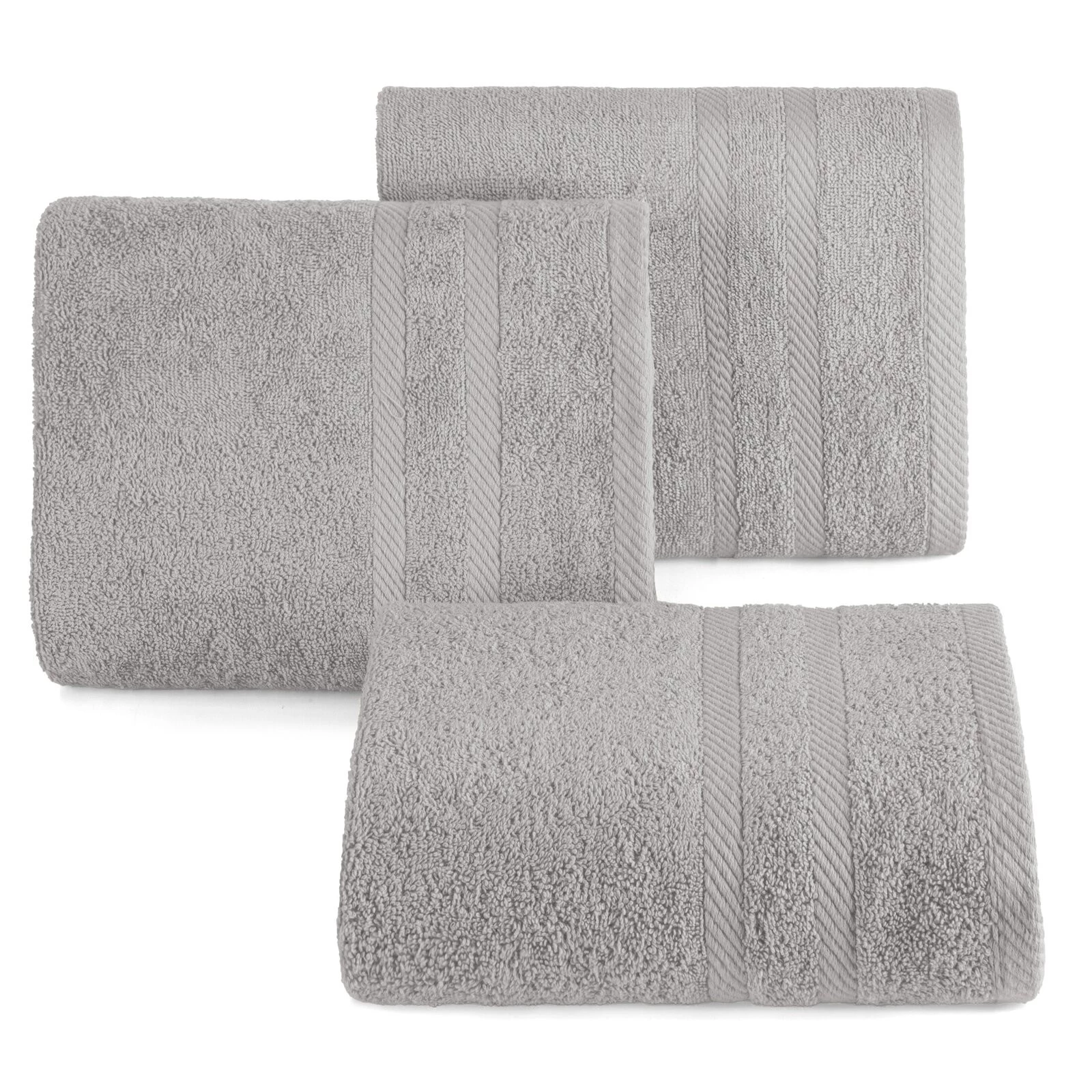 Jednobarwny ręcznik z miękkiej i chłonnej tkaniny bawełnianej o splocie frotte zdobiony kolorową bordiurą w stylu fastrygi. Łatwy w praniu, nie farbuje. szerokość: 30 cm, długość: 50 cm, kolor: srebrny, Gramatura: 500 GSM, Skład: 100% bawełna