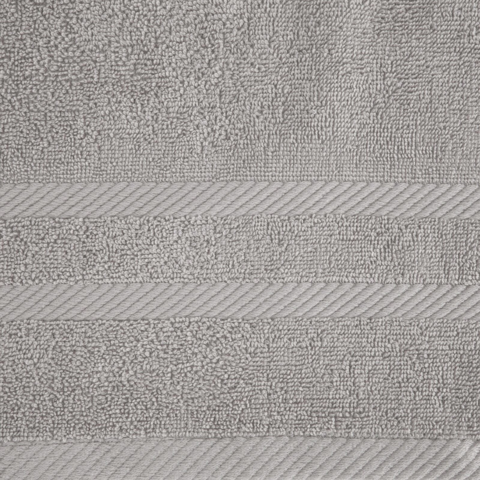 Jednobarwny ręcznik z miękkiej i chłonnej tkaniny bawełnianej o splocie frotte zdobiony kolorową bordiurą w stylu fastrygi. Łatwy w praniu, nie farbuje. szerokość: 70 cm, długość: 140 cm, kolor: srebrny, Gramatura: 500 GSM, Skład: 100% bawełna