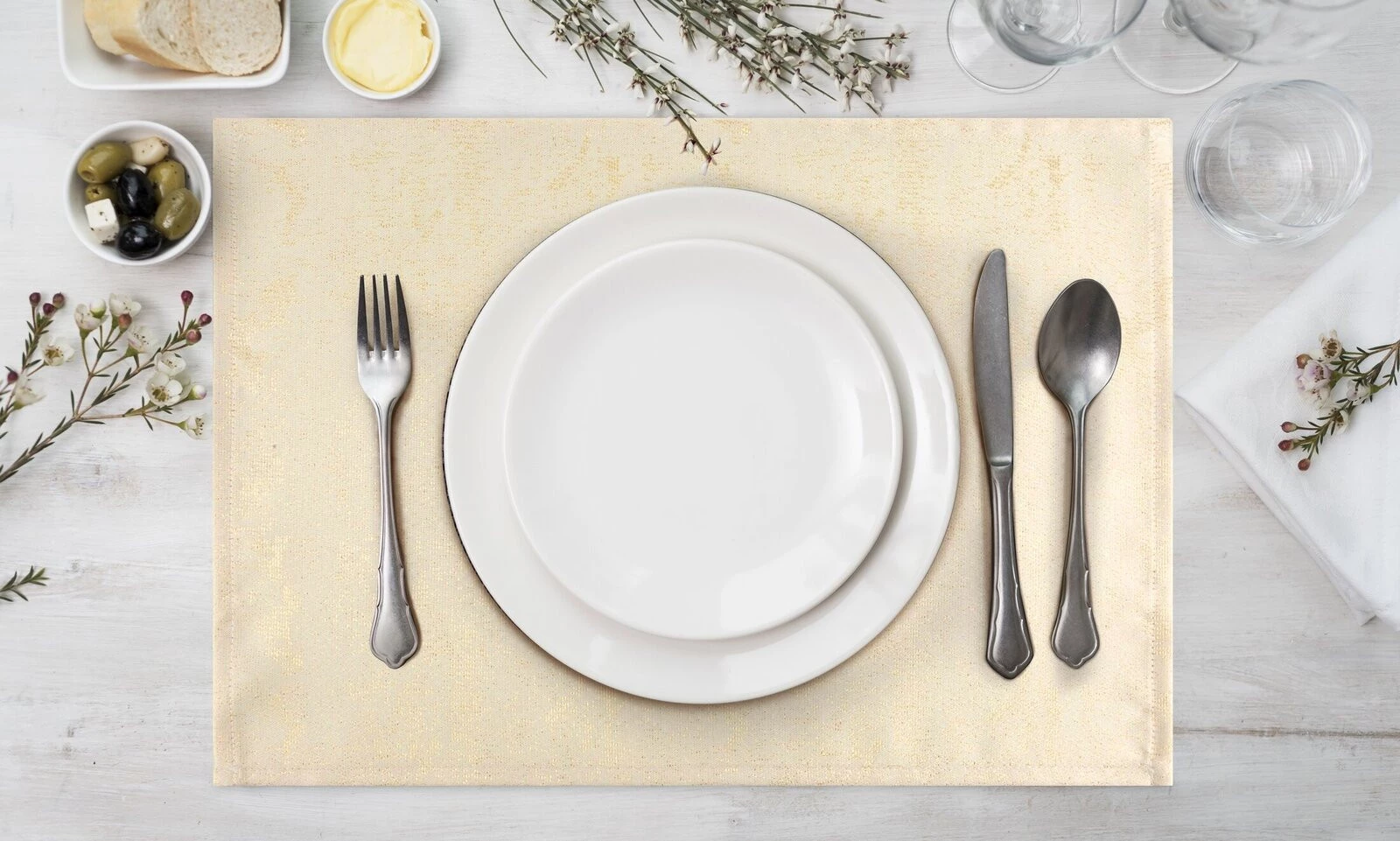 Kremowe podkładki dekoracyjne z delikatnym złotym połyskiem szerokość: 30 cm, długość: 40 cm, kolor: kremowy, Gramatura: 125 GSM, Skład: 94% poliester, 6% nić metaliczna