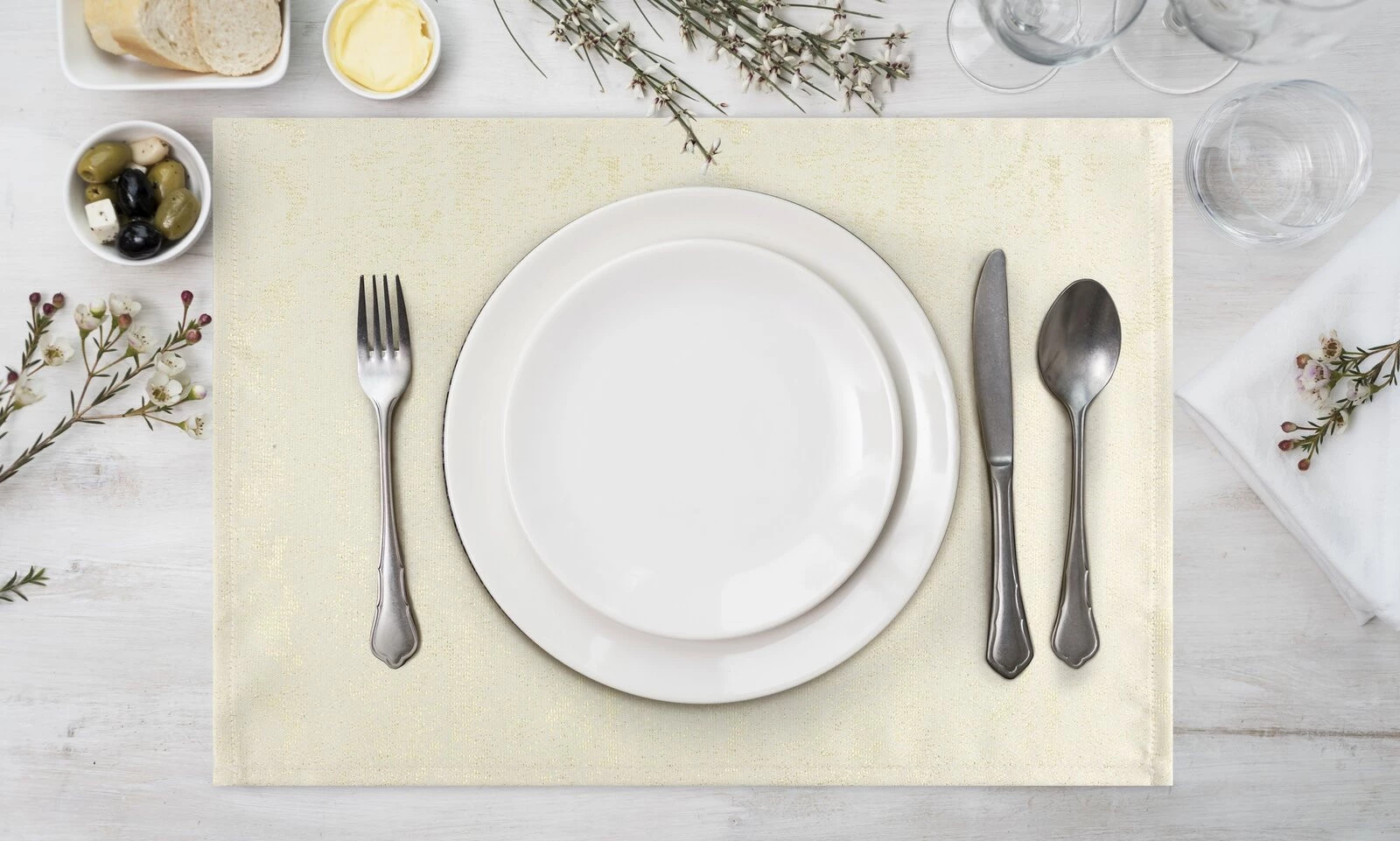 - Kremowy bieżnik z delikatnym złotym połyskiem szerokość: 40 cm, długość: 180 cm, kolor: kremowy, Gramatura: 125 GSM, Skład: 94% poliester, 6% nić metaliczna