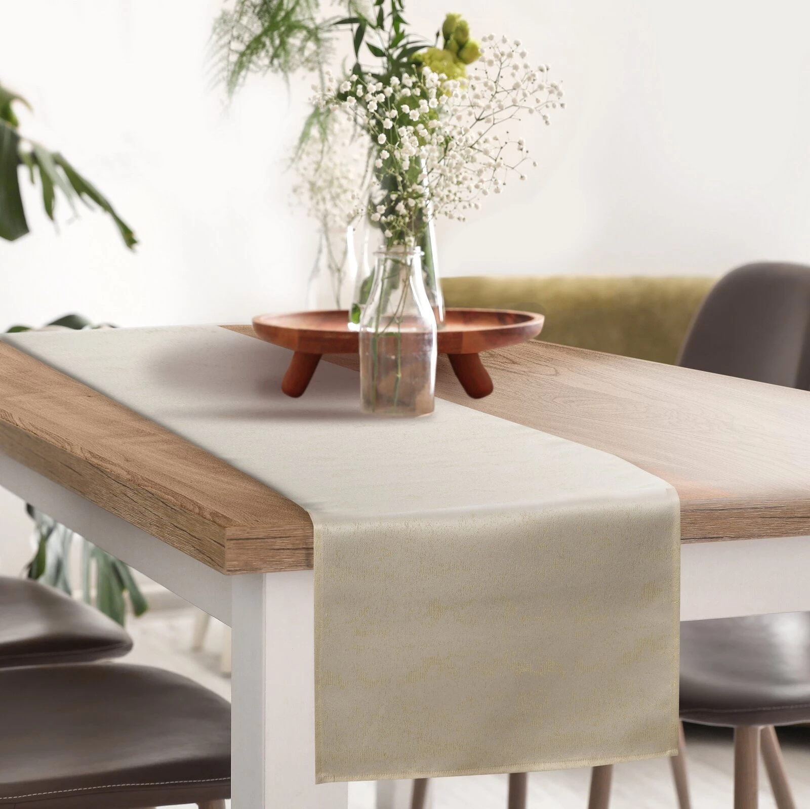 Kremowy bieżnik z delikatnym złotym połyskiem szerokość: 40 cm, długość: 180 cm, kolor: kremowy, Gramatura: 125 GSM, Skład: 94% poliester, 6% nić metaliczna
