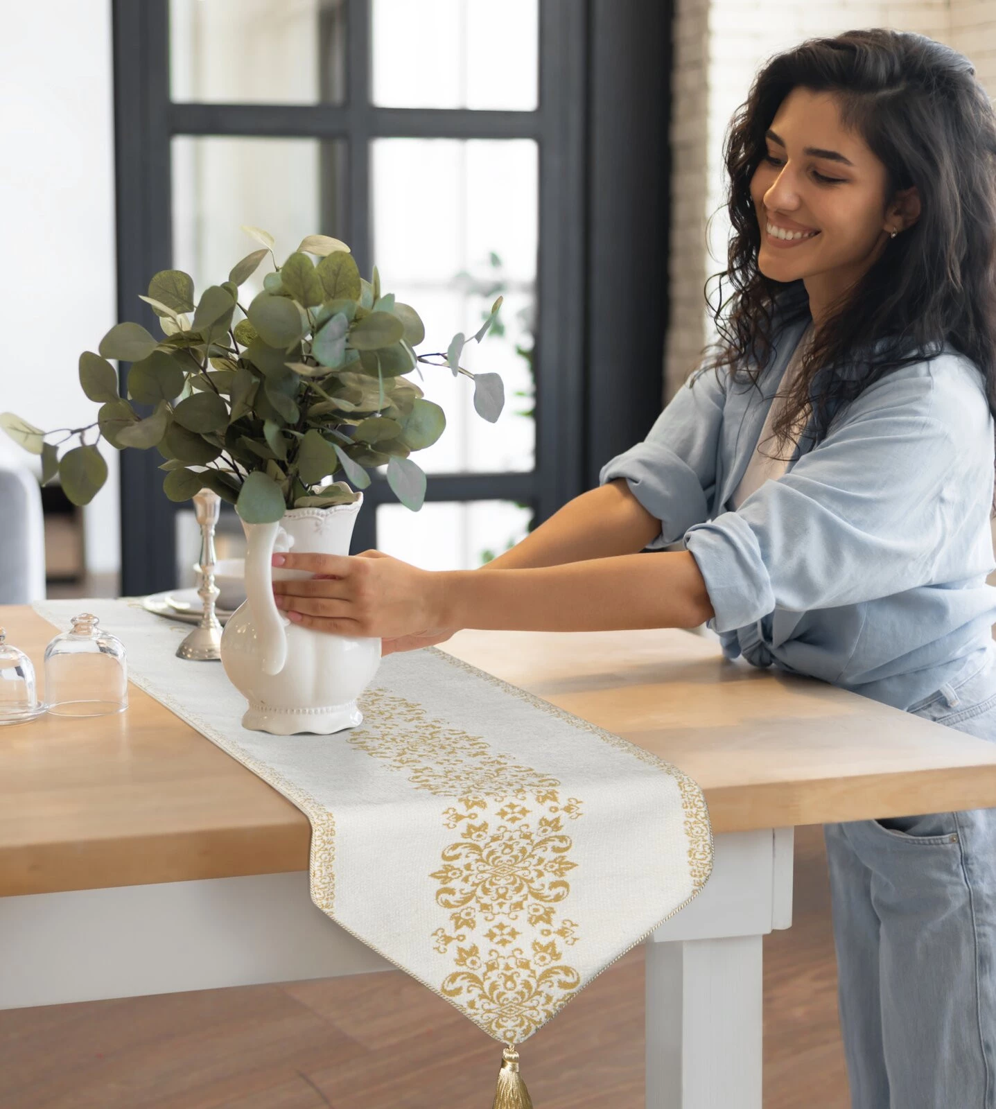 Kremowy bieżnik ze złotym zdobieniem szerokość: 30 cm, długość: 120 cm, kolor: biały, Gramatura: 500 GSM, Skład: 75% poliester, 24% wiskoza, 1% nić metaliczna