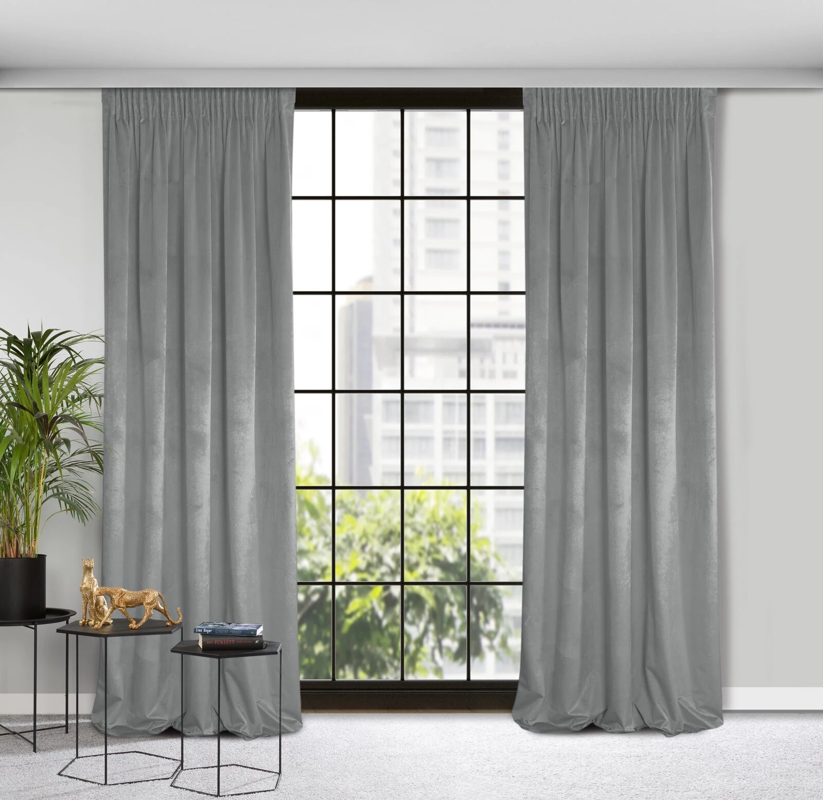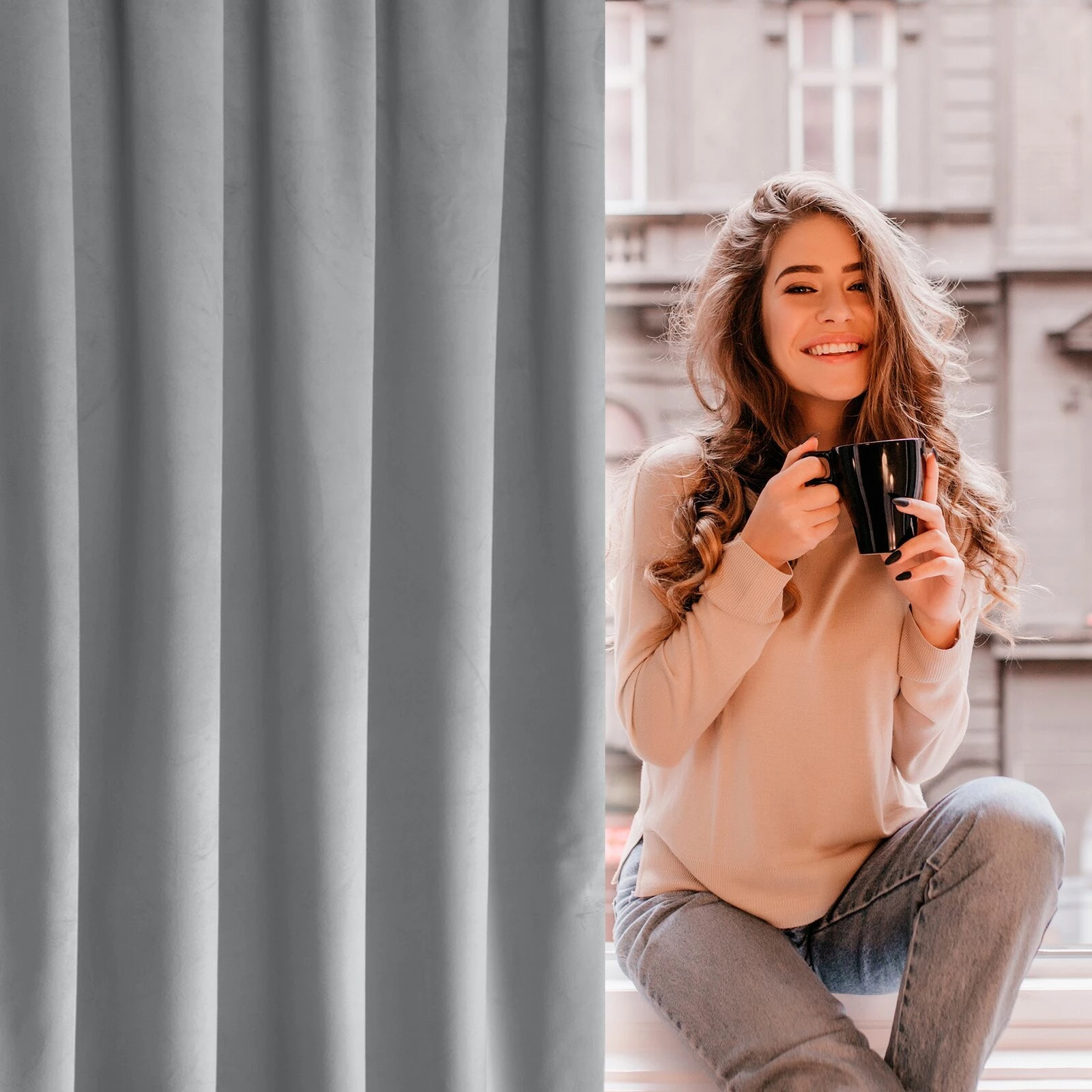 - Zasłona welwetowa jednokolorowa szerokość: 135 cm, długość: 300 cm, kolor: srebrny, Gramatura: 200 GSM, Skład: 100% poliester
