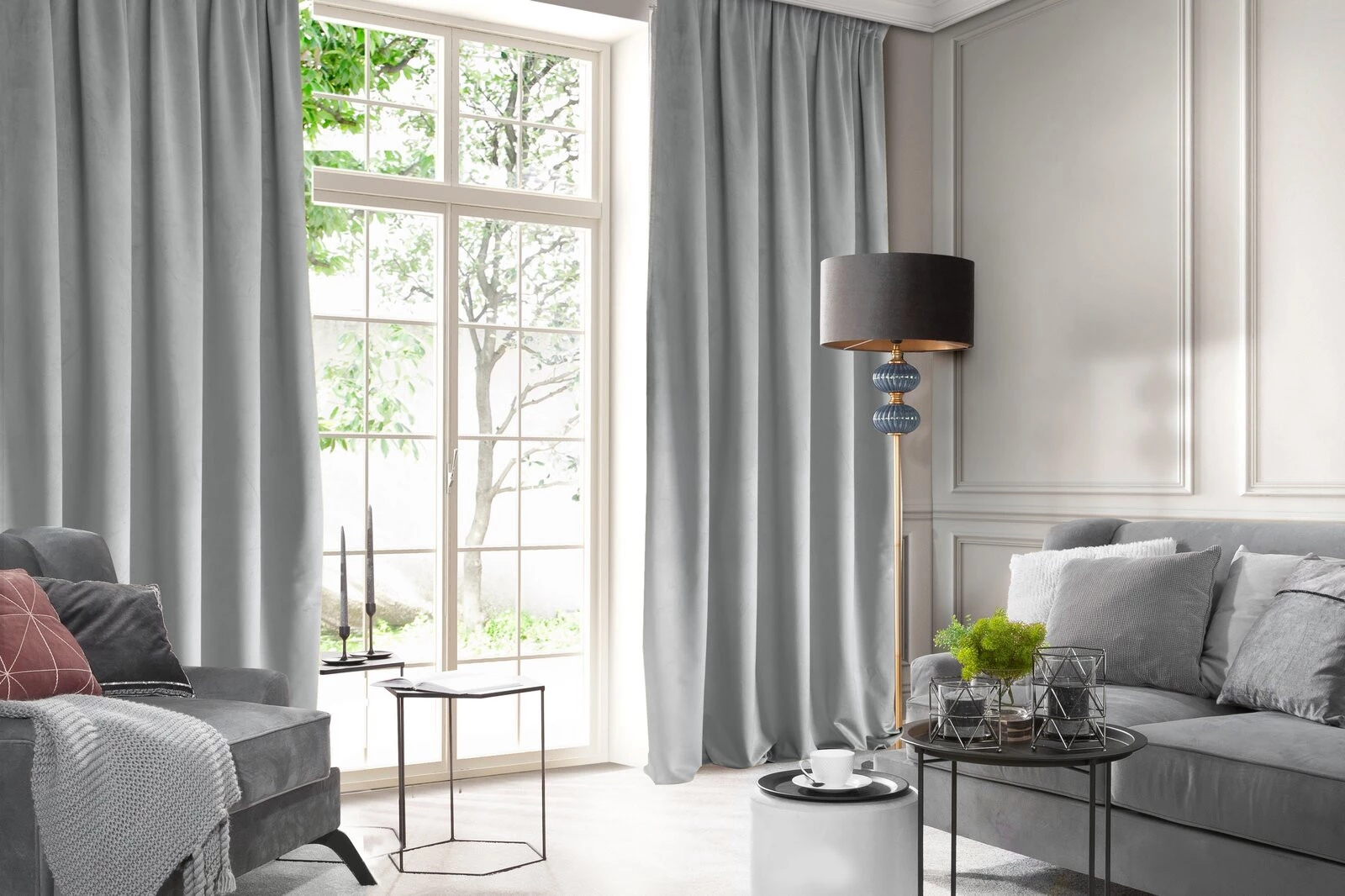 Zasłona welwetowa jednokolorowa szerokość: 135 cm, długość: 300 cm, kolor: srebrny, Gramatura: 200 GSM, Skład: 100% poliester