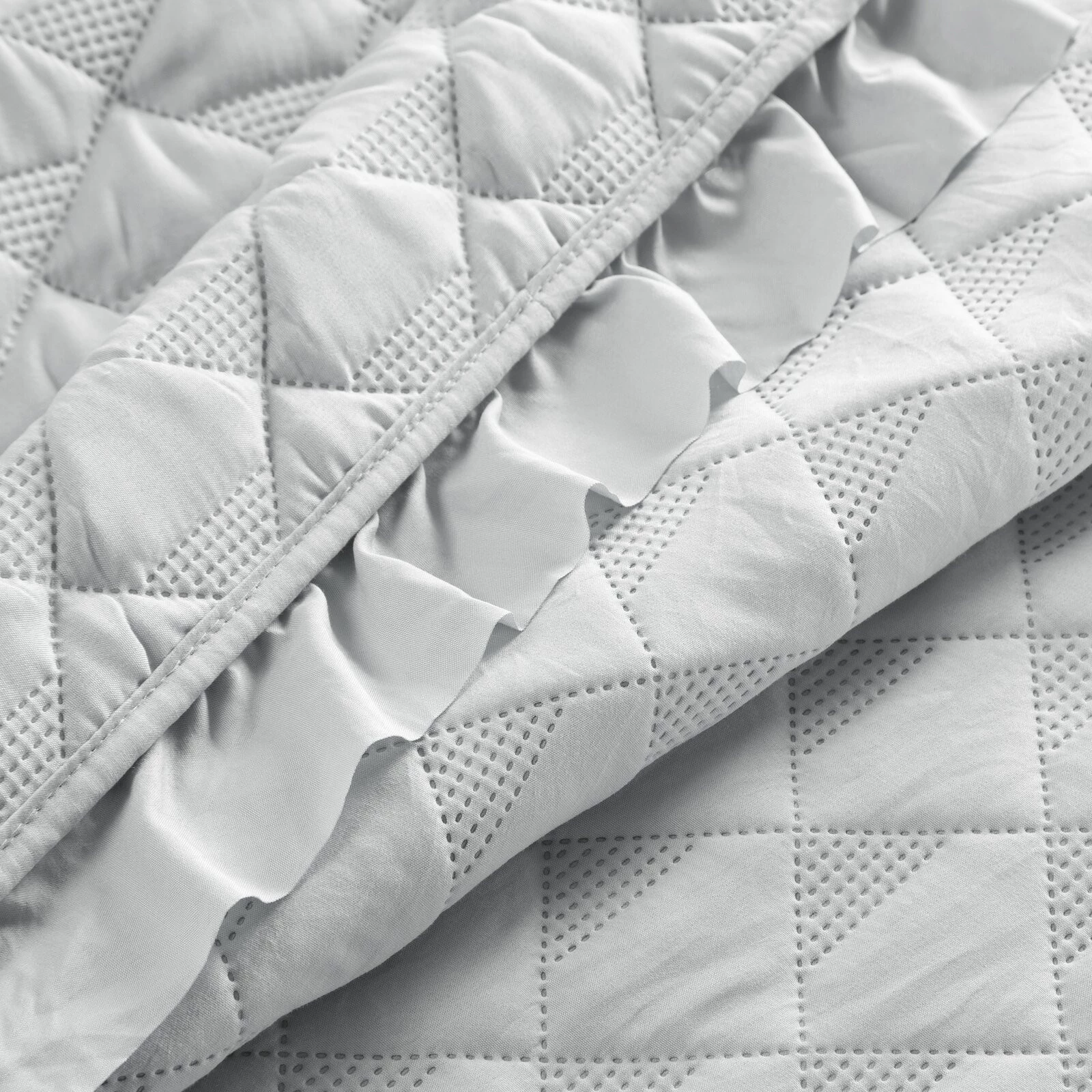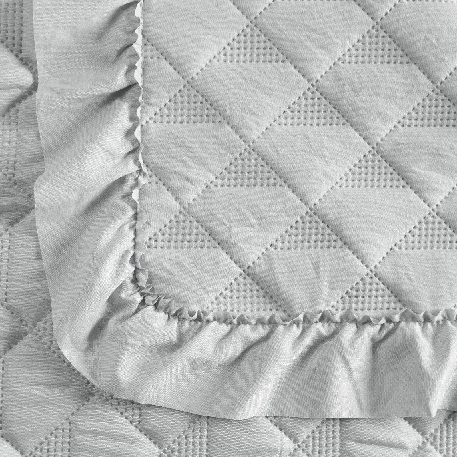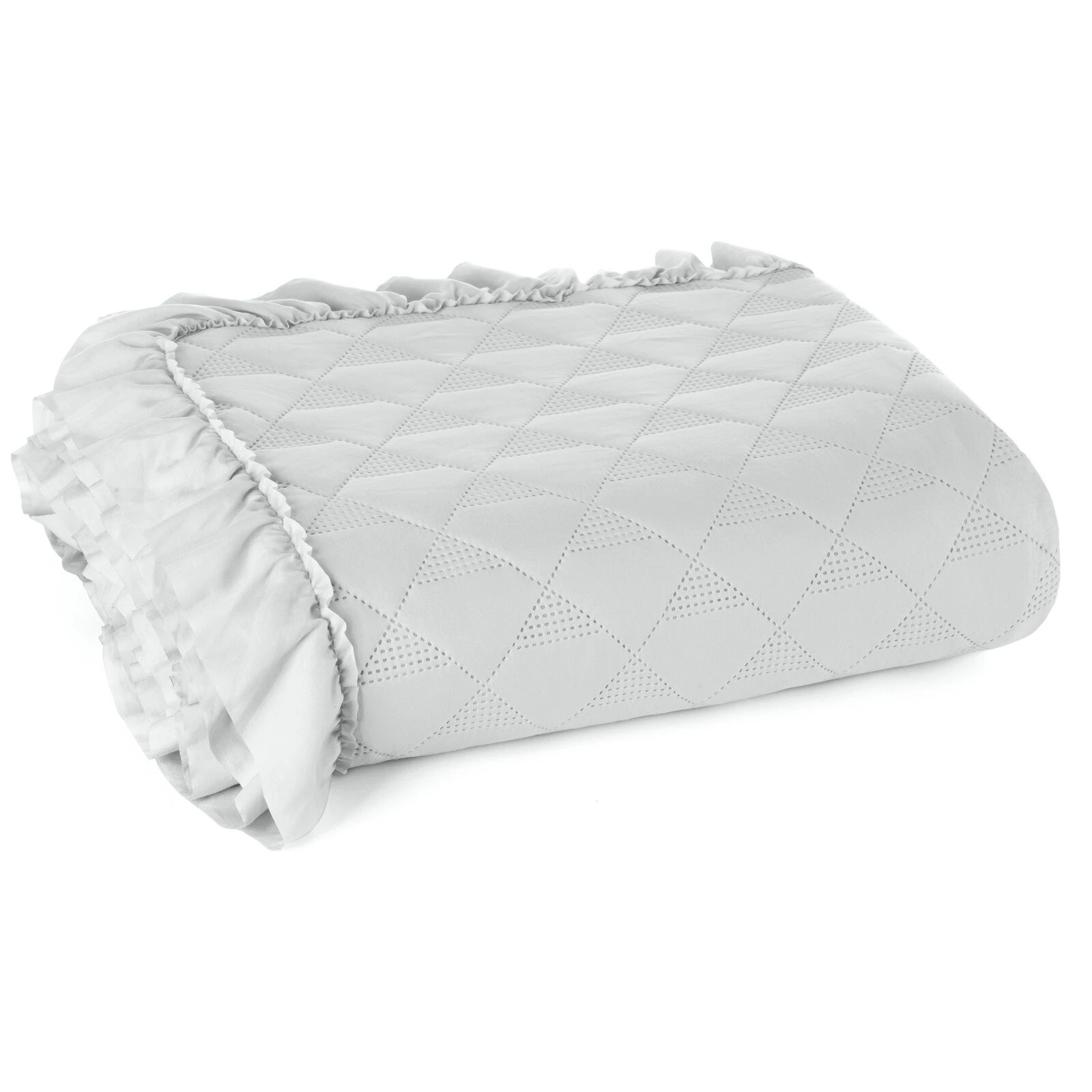 Narzuta jednokolorowa wykonana techniką hot press z falbaną szerokość: 220 cm, długość: 240 cm, kolor: srebrny, Gramatura: 80 GSM, Skład: 100% poliester
