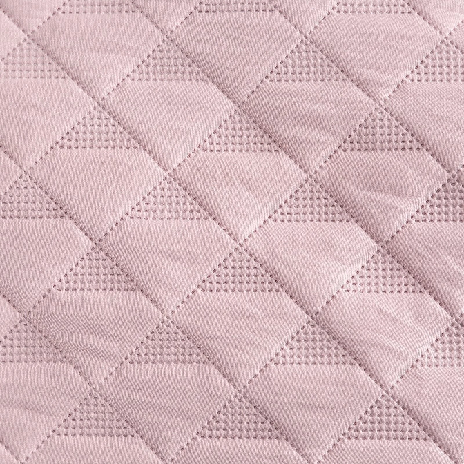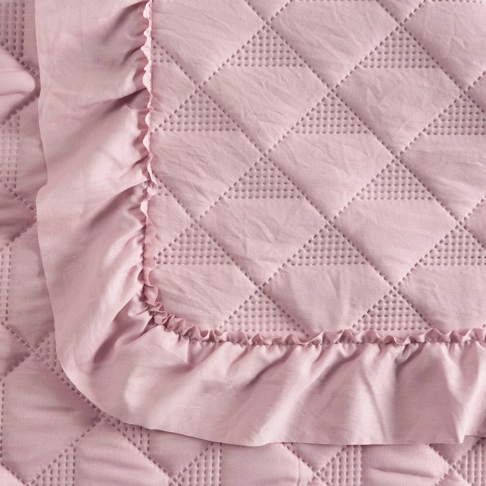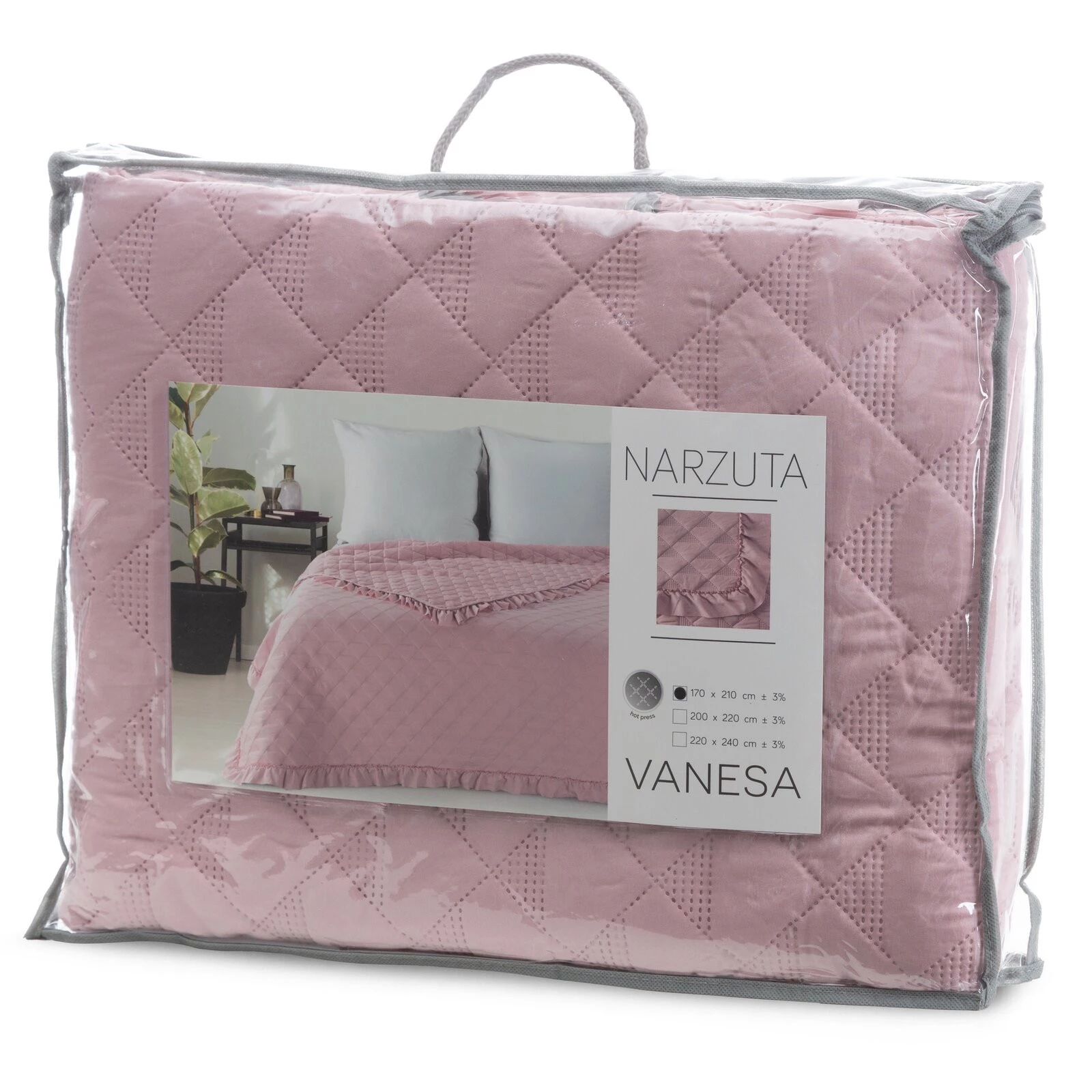 Narzuta jednokolorowa wykonana techniką hot press z falbaną szerokość: 220 cm, długość: 240 cm, kolor: pudrowy róż, Gramatura: 80 GSM, Skład: 100% poliester