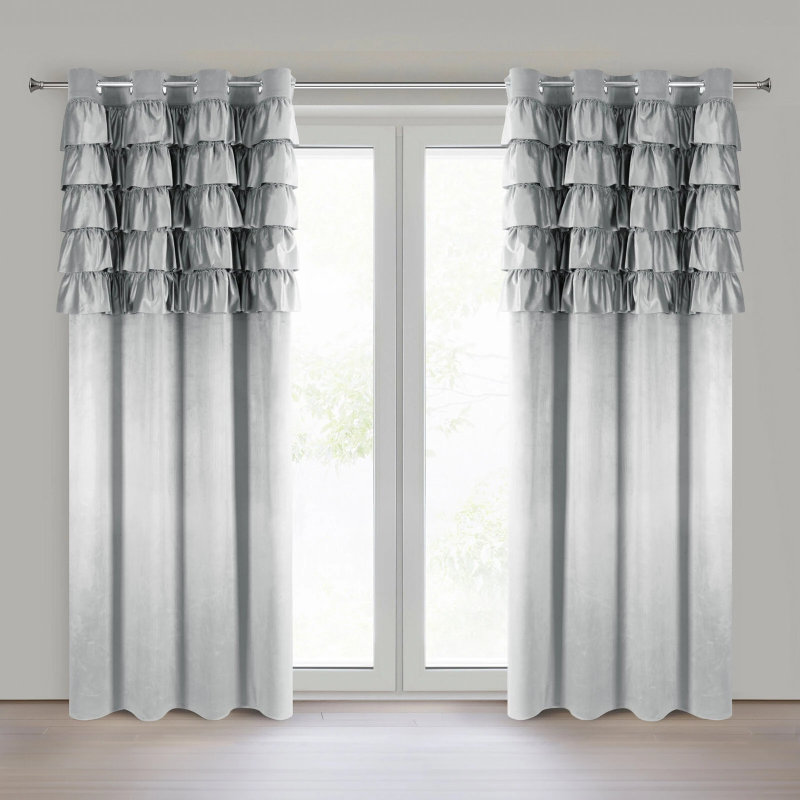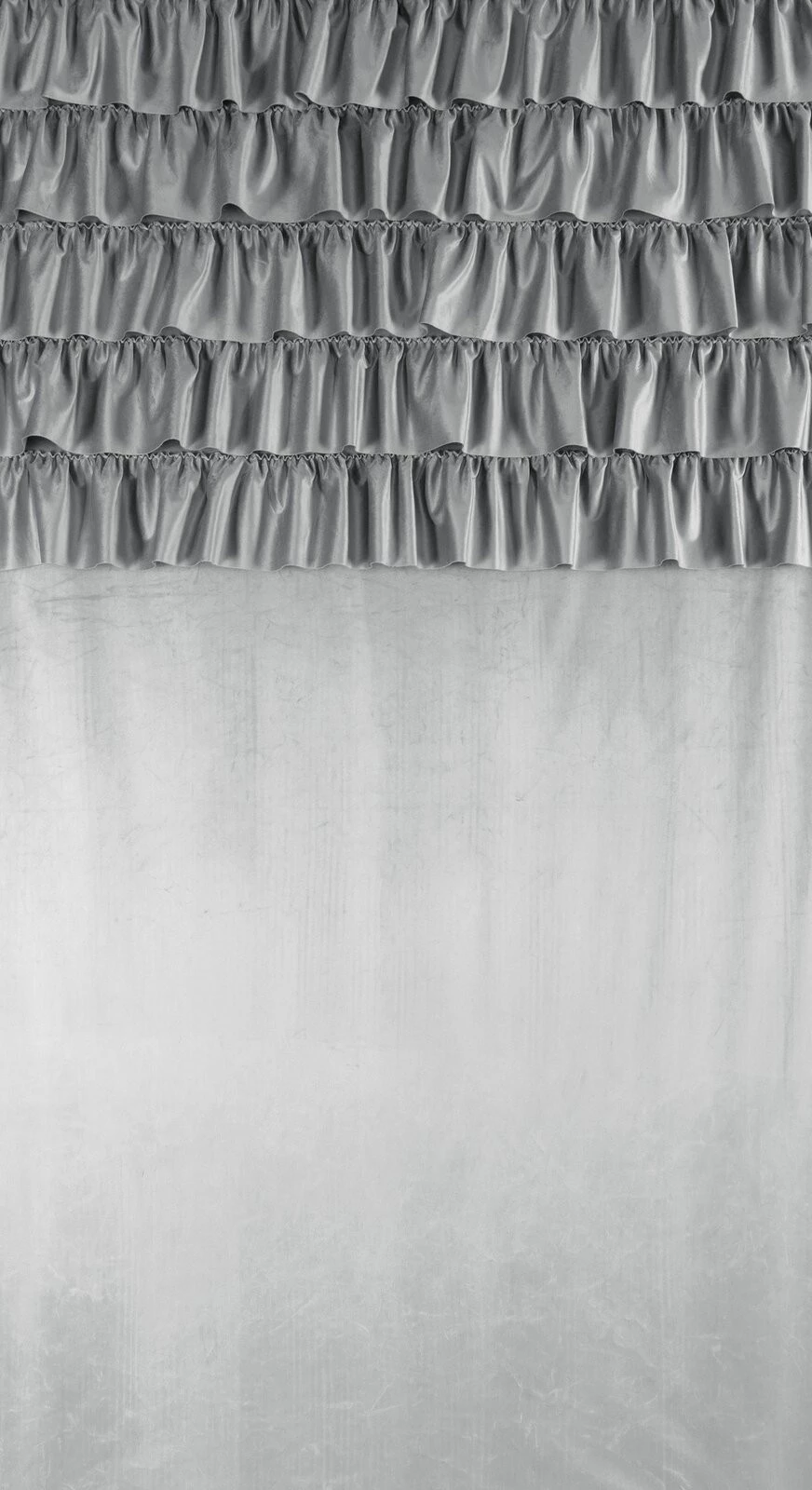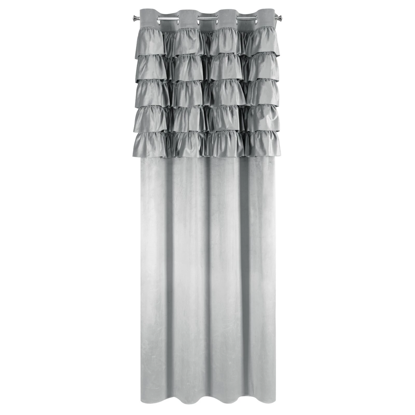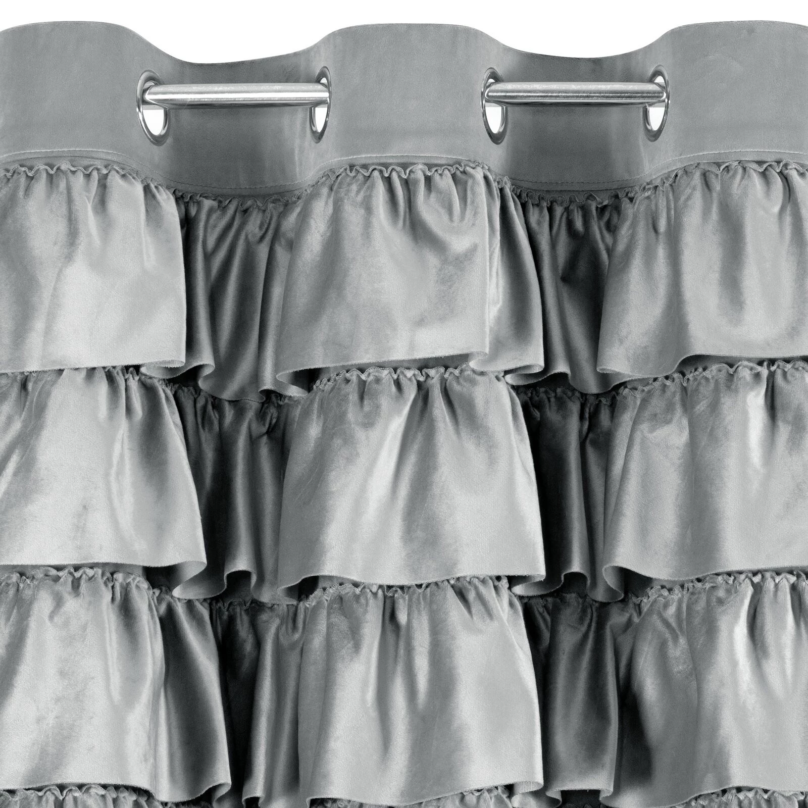 - Zasłona gotowa welwetowa z falbanami od góry szerokość: 140 cm, długość: 250 cm, kolor: srebrny, Gramatura: 200 GSM, Skład: 100% poliester