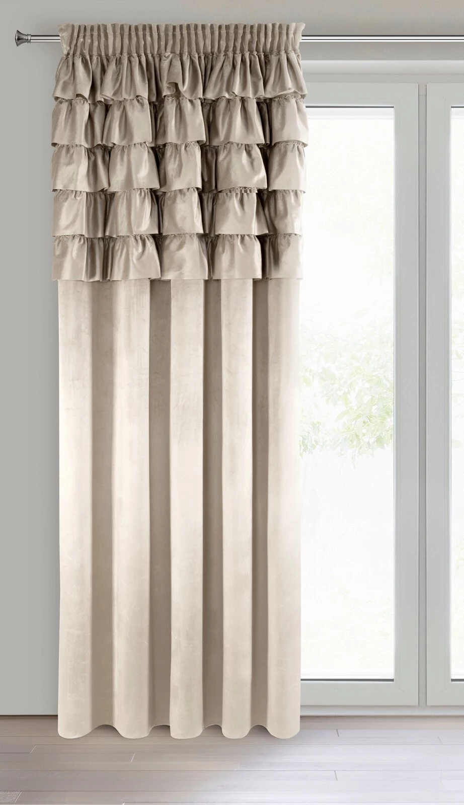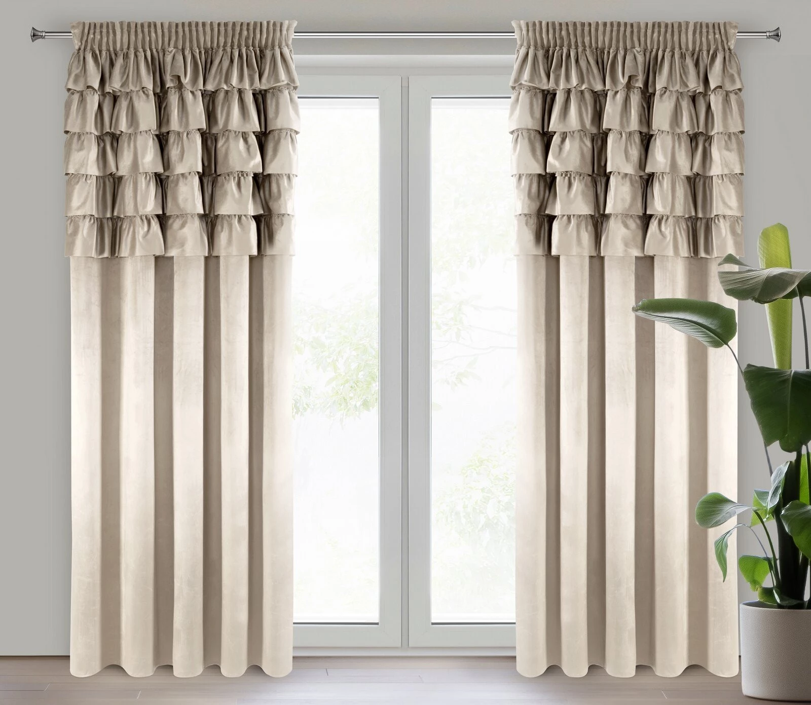 - Zasłona gotowa welwetowa z falbanami od góry szerokość: 140 cm, długość: 270 cm, kolor: beżowy, Gramatura: 200 GSM, Skład: 100% poliester