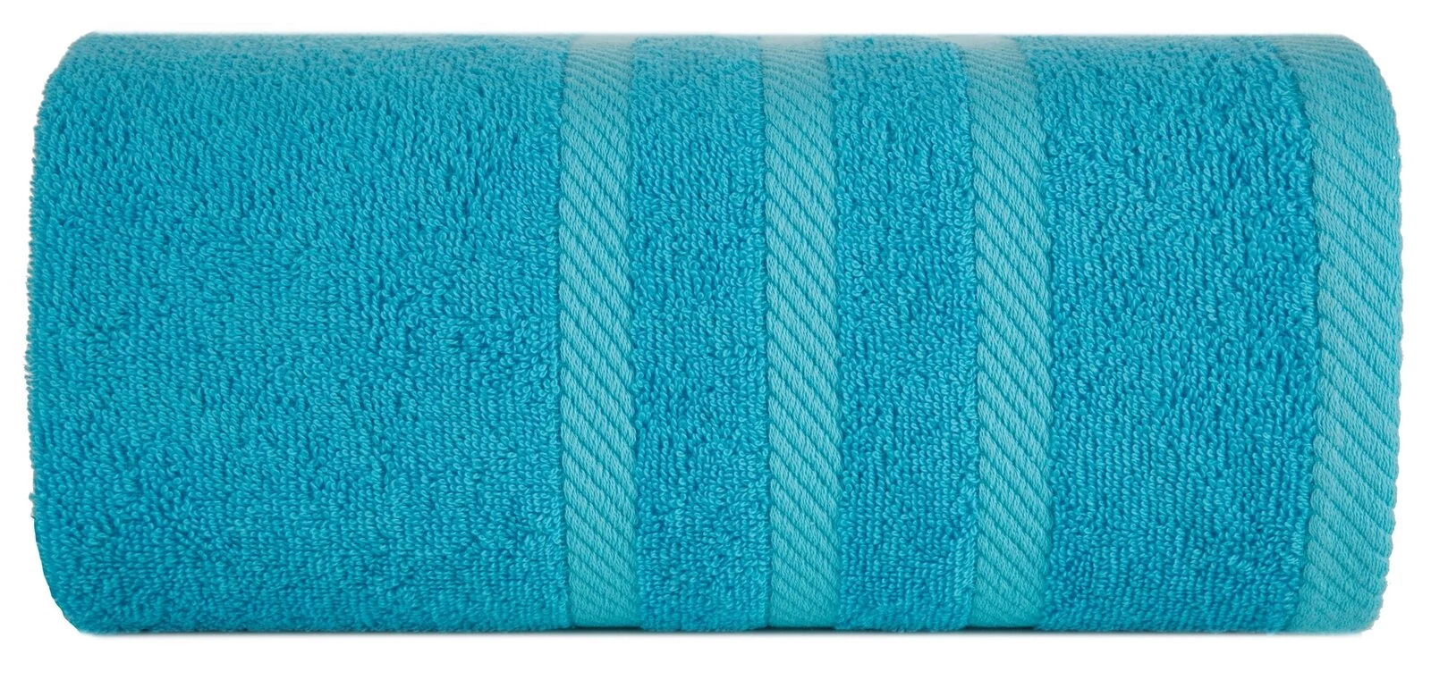 Jednobarwny ręcznik z miękkiej i chłonnej tkaniny bawełnianej o splocie frotte zdobiony kolorową bordiurą w stylu fastrygi. Łatwy w praniu, nie farbuje. szerokość: 30 cm, długość: 50 cm, kolor: niebieski, Gramatura: 500 GSM, Skład: 100% bawełna