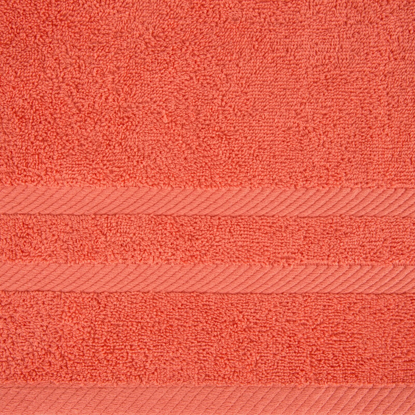Jednobarwny ręcznik z miękkiej i chłonnej tkaniny bawełnianej o splocie frotte zdobiony kolorową bordiurą w stylu fastrygi. Łatwy w praniu, nie farbuje. szerokość: 100 cm, długość: 150 cm, kolor: koralowy, Gramatura: 500 GSM, Skład: 100% bawełna
