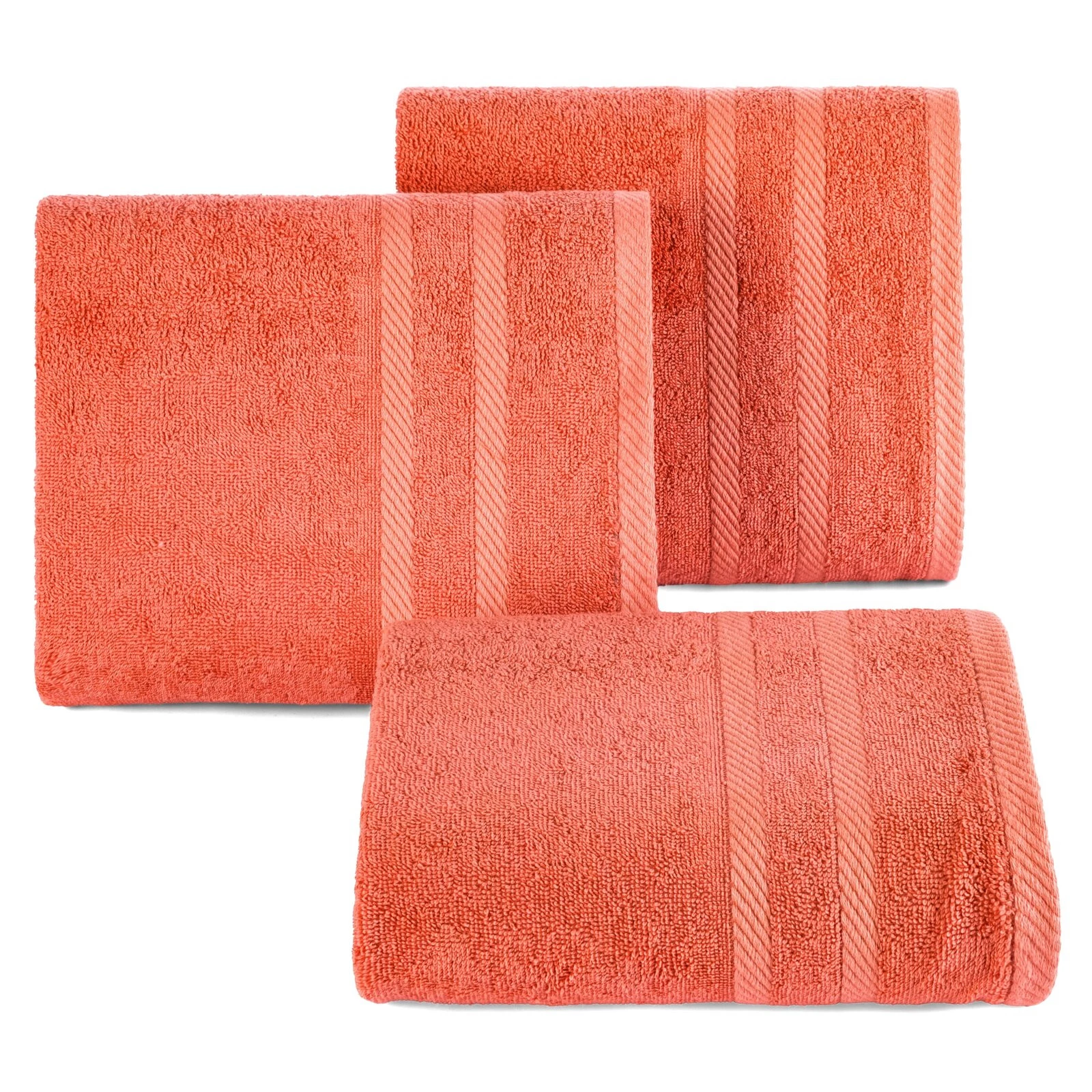 Jednobarwny ręcznik z miękkiej i chłonnej tkaniny bawełnianej o splocie frotte zdobiony kolorową bordiurą w stylu fastrygi. Łatwy w praniu, nie farbuje. szerokość: 70 cm, długość: 140 cm, kolor: koralowy, Gramatura: 500 GSM, Skład: 100% bawełna
