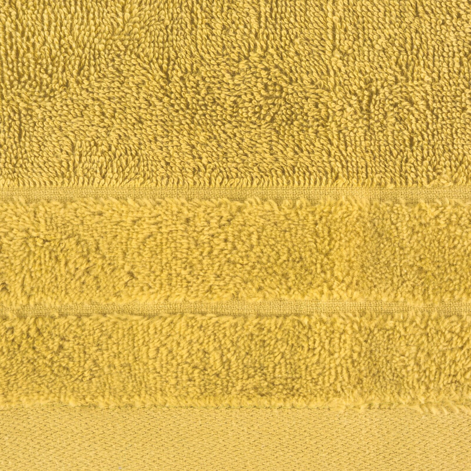 Elegancki ręcznik z delikatnej i bardzo chłonnej tkaniny frotte, jednokolorowy. Krawędzie zdobione subtelną bordiurą z welwetu. Łatwy w praniu, trwałe kolory. szerokość: 30 cm, długość: 50 cm, kolor: musztardowy, Gramatura: 500 GSM, Skład: 100% bawełna