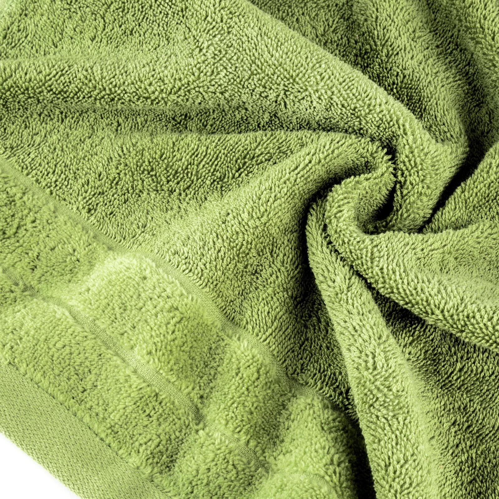 Elegancki ręcznik z delikatnej i bardzo chłonnej tkaniny frotte, jednokolorowy. Krawędzie zdobione subtelną bordiurą z welwetu. Łatwy w praniu, trwałe kolory. szerokość: 50 cm, długość: 90 cm, kolor: oliwkowy, Gramatura: 500 GSM, Skład: 100% bawełna