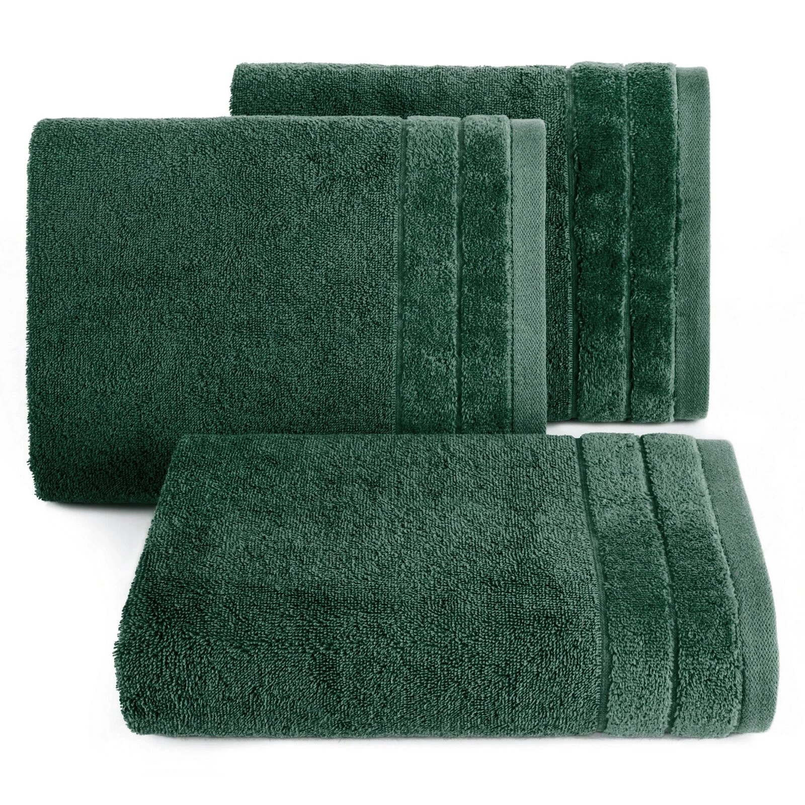 Elegancki ręcznik z delikatnej i bardzo chłonnej tkaniny frotte, jednokolorowy. Krawędzie zdobione subtelną bordiurą z welwetu. Łatwy w praniu, trwałe kolory. szerokość: 70 cm, długość: 140 cm, kolor: butelkowy zielony, Gramatura: 500 GSM, Skład: 100% bawełna