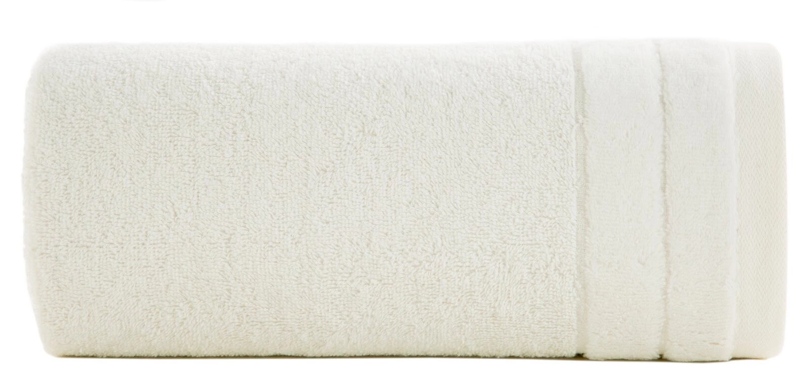 Elegancki ręcznik z delikatnej i bardzo chłonnej tkaniny frotte, jednokolorowy. Krawędzie zdobione subtelną bordiurą z welwetu. Łatwy w praniu, trwałe kolory. szerokość: 30 cm, długość: 50 cm, kolor: kremowy, Gramatura: 500 GSM, Skład: 100% bawełna