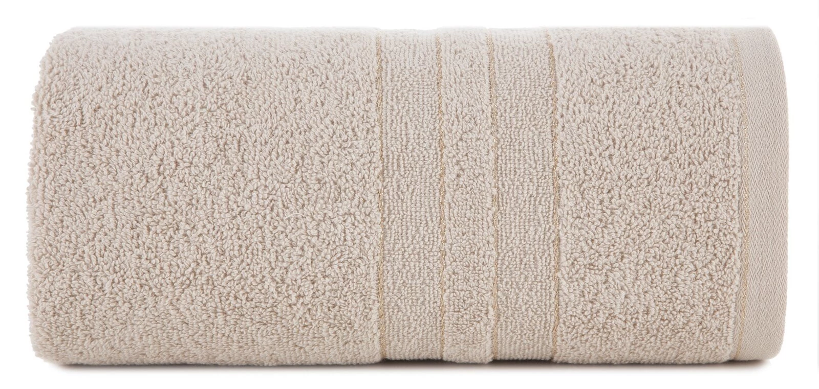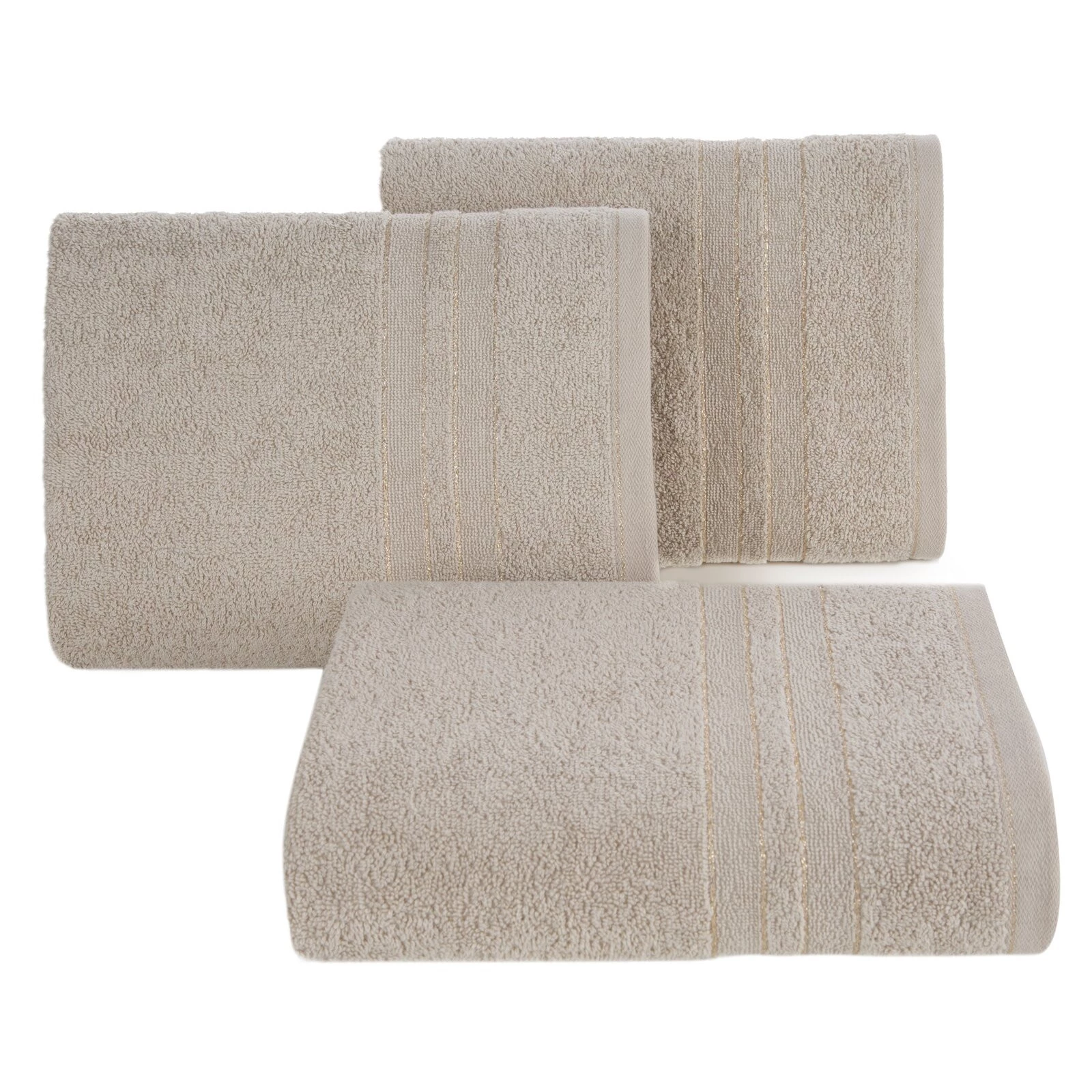 Ręcznik bawełniany z bordiurą zdobioną błyszczącą nicią szerokość: 50 cm, długość: 90 cm, kolor: beżowy, Gramatura: 500 GSM, Skład: 100% bawełna; część ozdobna: 95% bawełna, 5% poliester