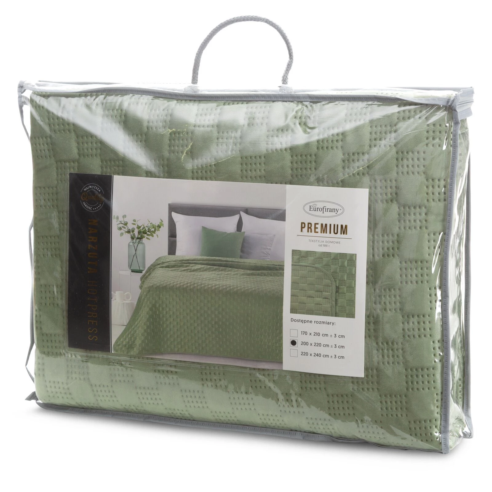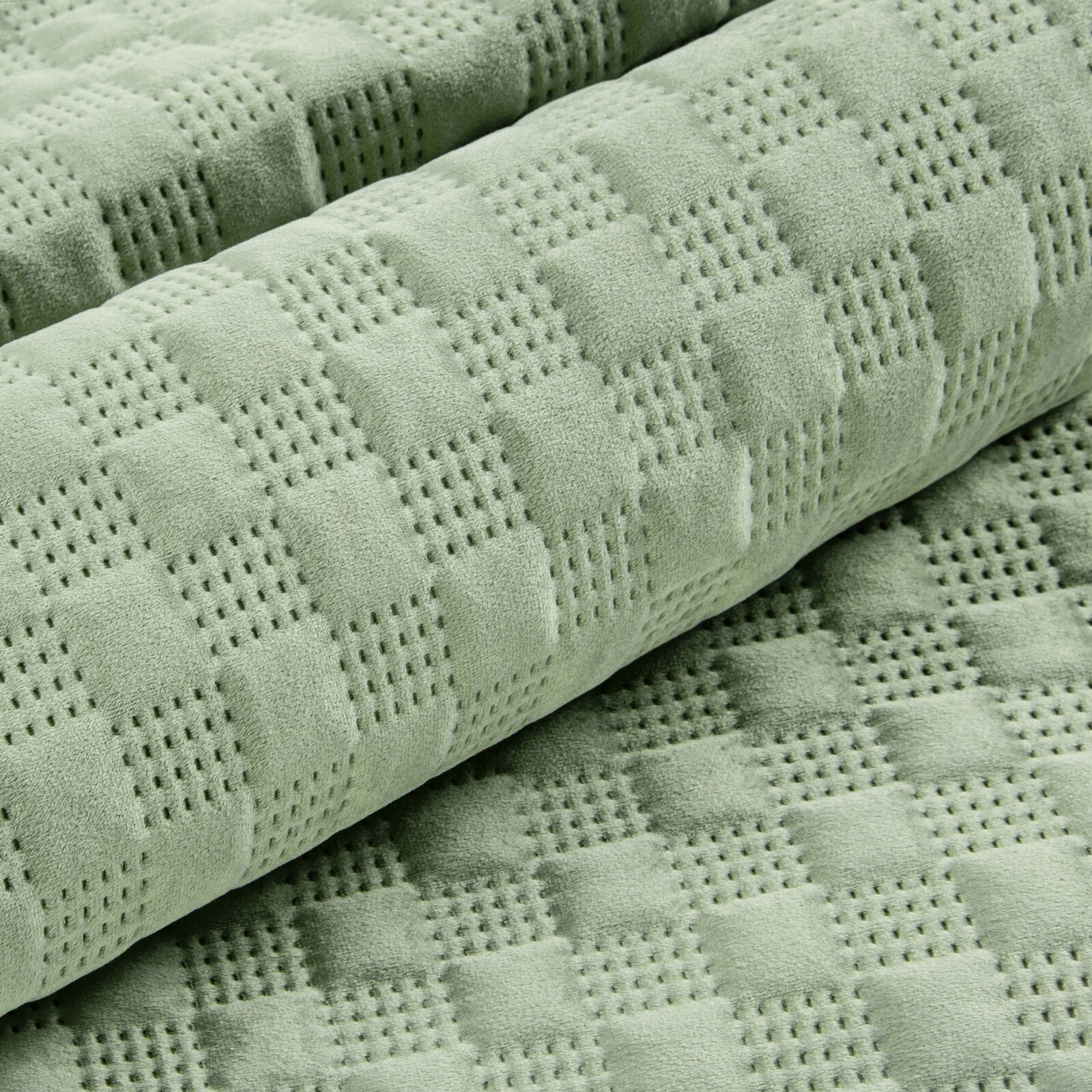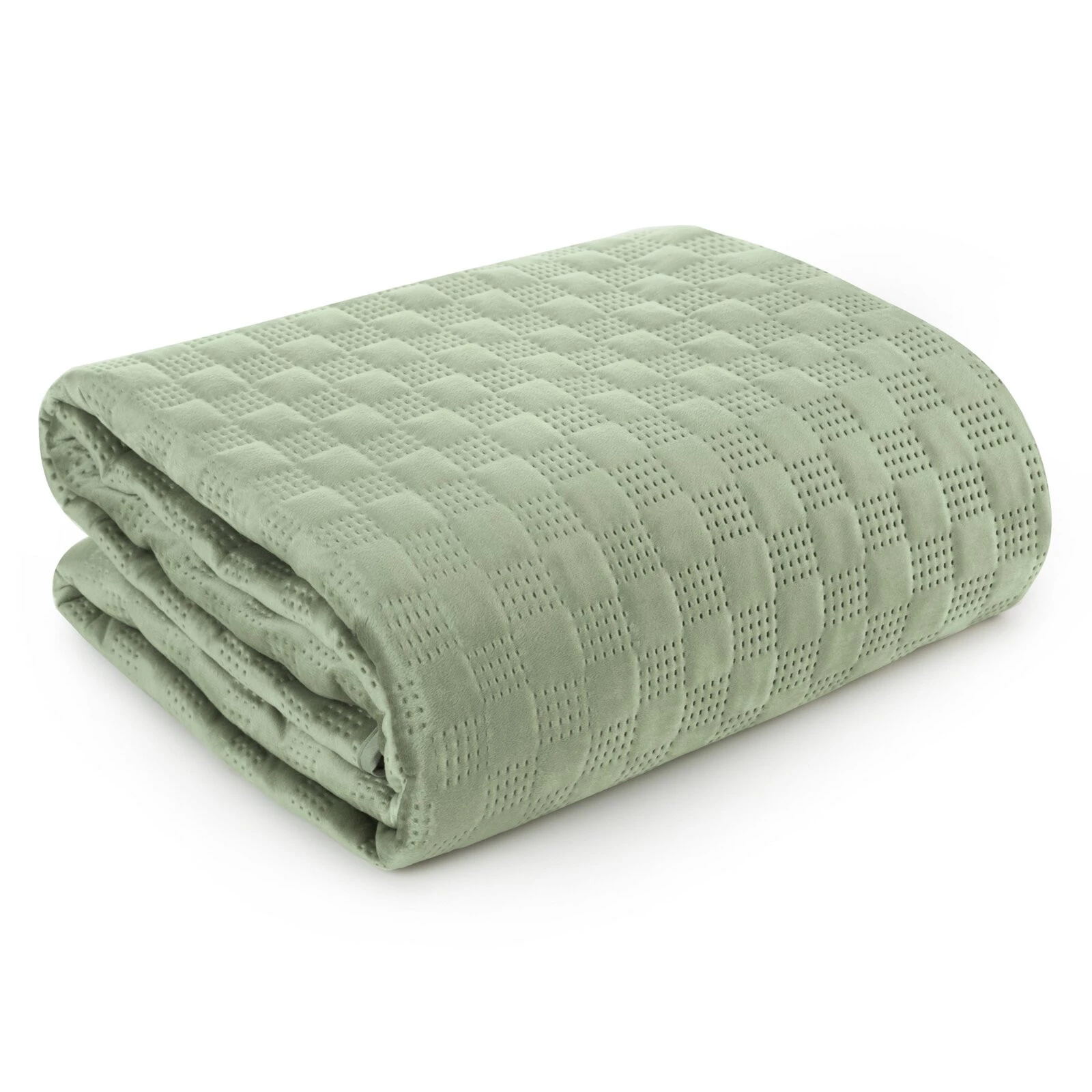 Ekskluzywna narzuta na łóżko z miękkiego i przyjemnego w dotyku welwetu pikowanego w dużą, gęstą jodełką. Do pikowania wykorzystano metodę bezszwową hotpress. szerokość: 220 cm, długość: 240 cm, kolor: jasnozielony, Gramatura: 250 GSM, Skład: 100% poliester