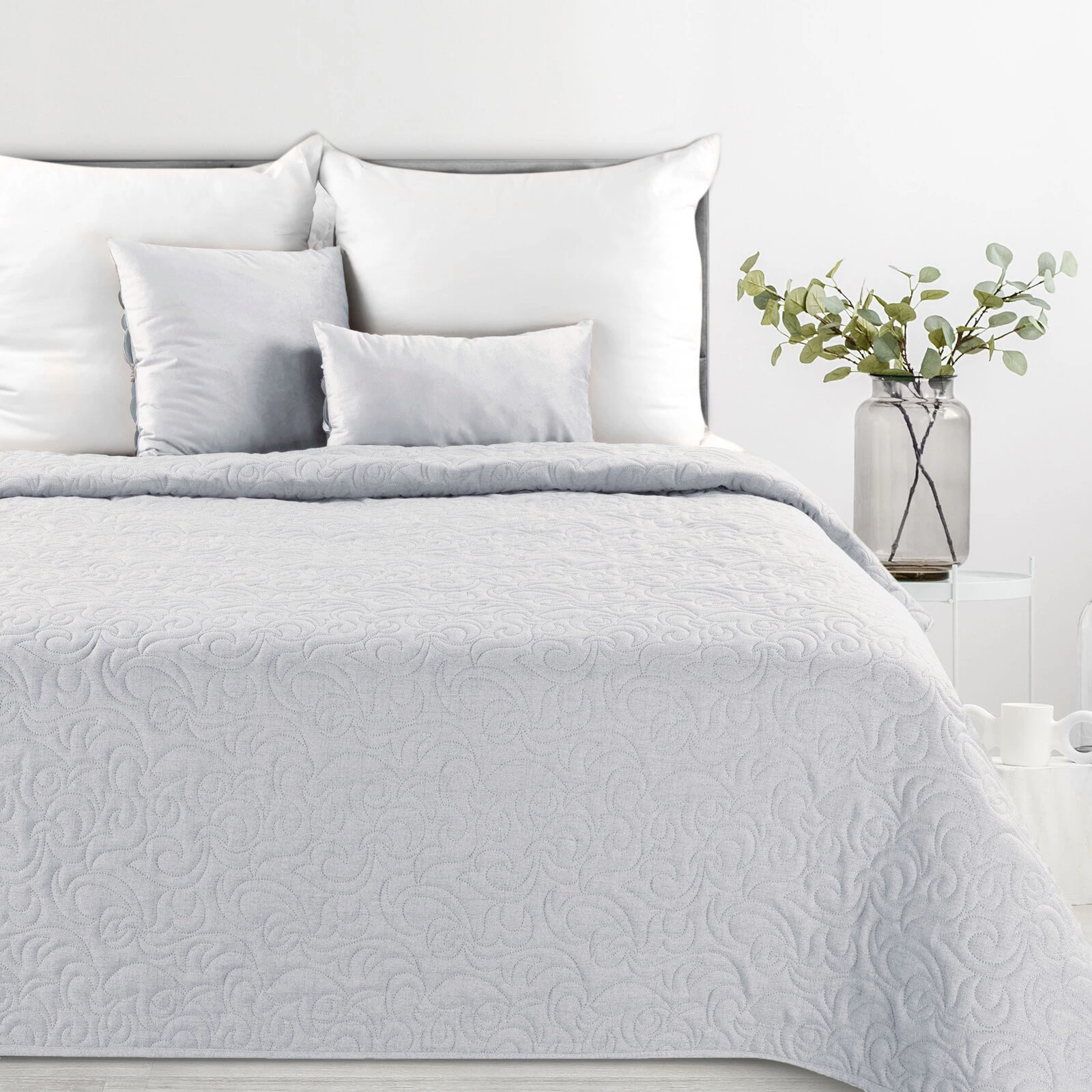 - Narzuta hot press imitująca len szerokość: 170 cm, długość: 210 cm, kolor: srebrny, Gramatura: 185 GSM, Skład: 100% poliester
