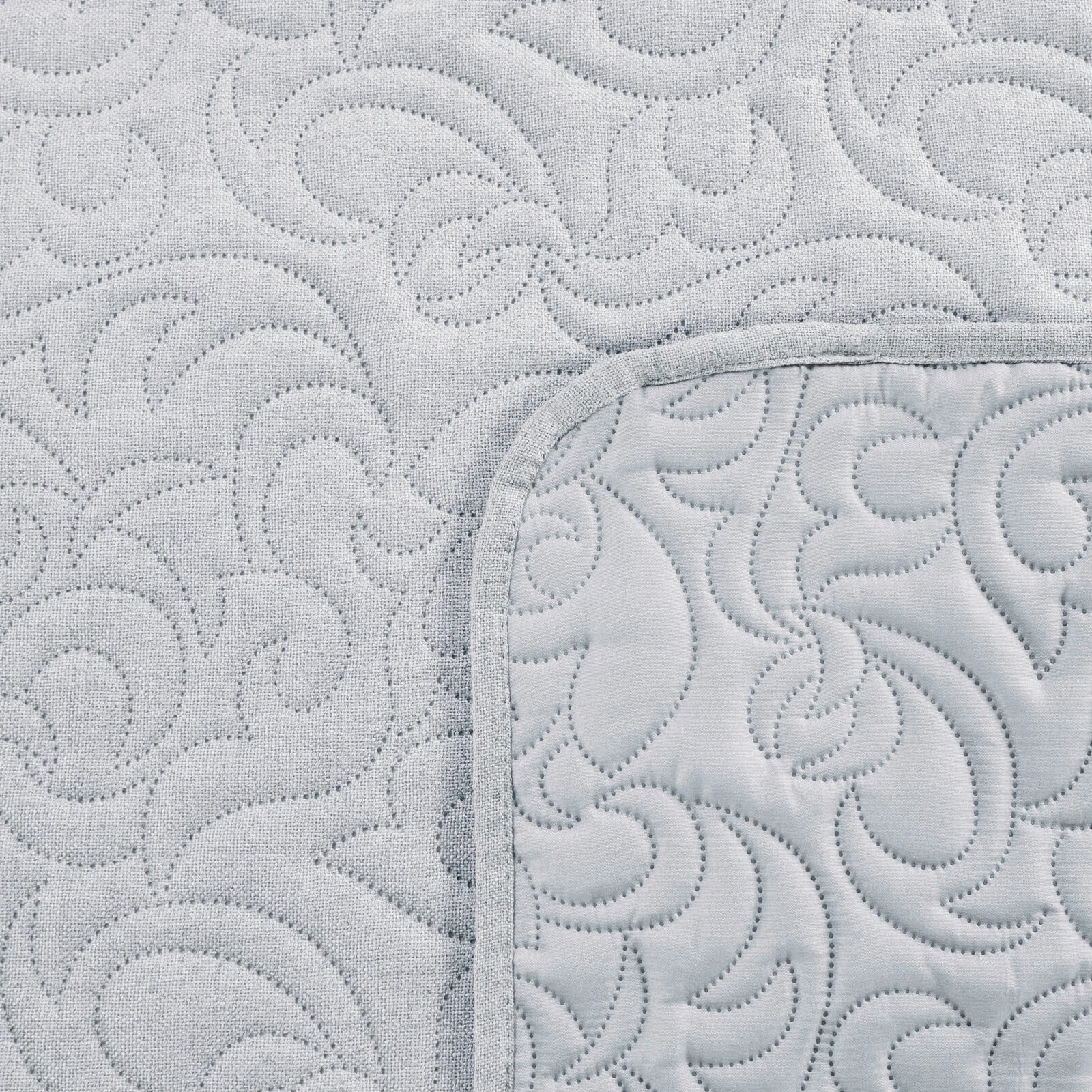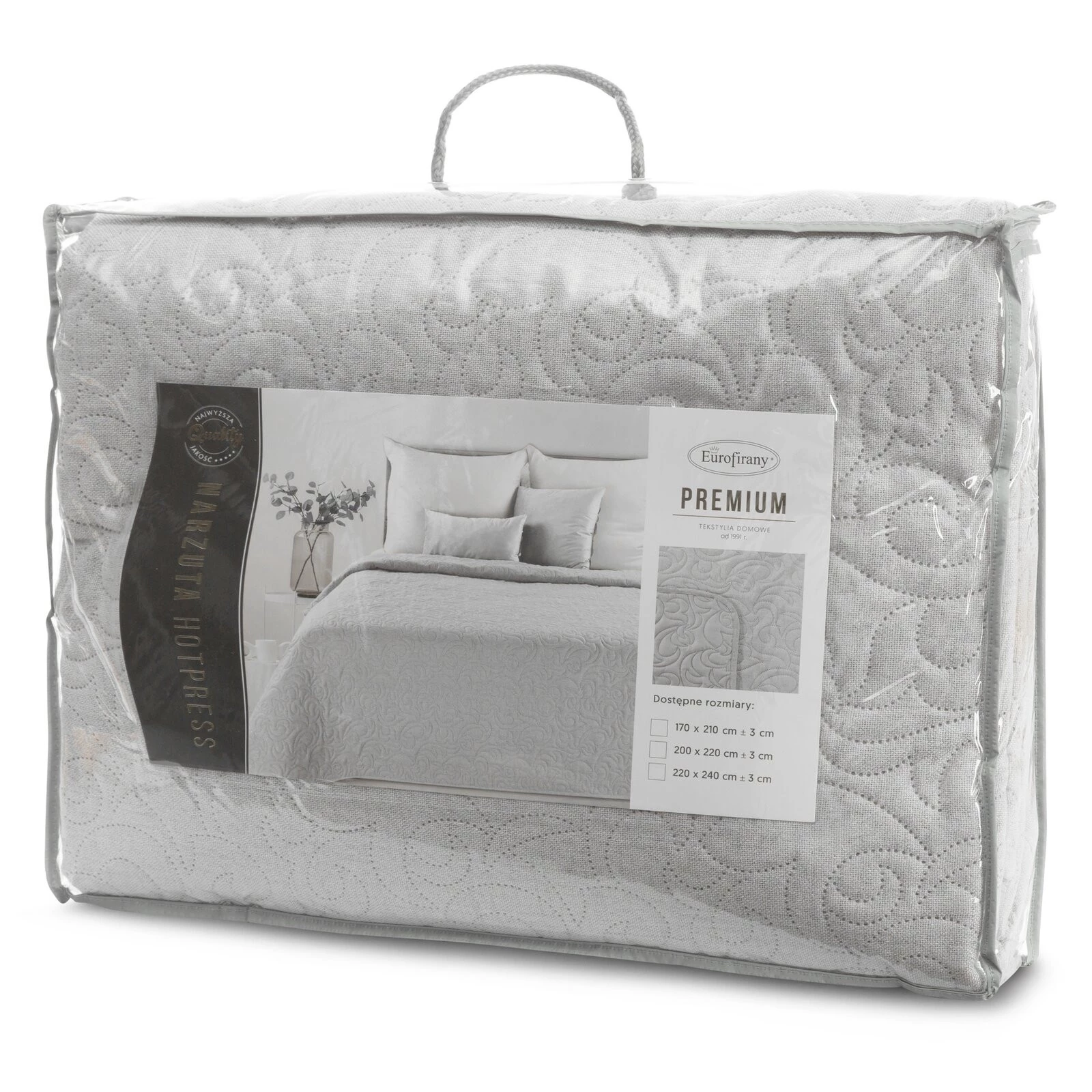 - Narzuta hot press imitująca len szerokość: 200 cm, długość: 220 cm, kolor: srebrny, Gramatura: 185 GSM, Skład: 100% poliester