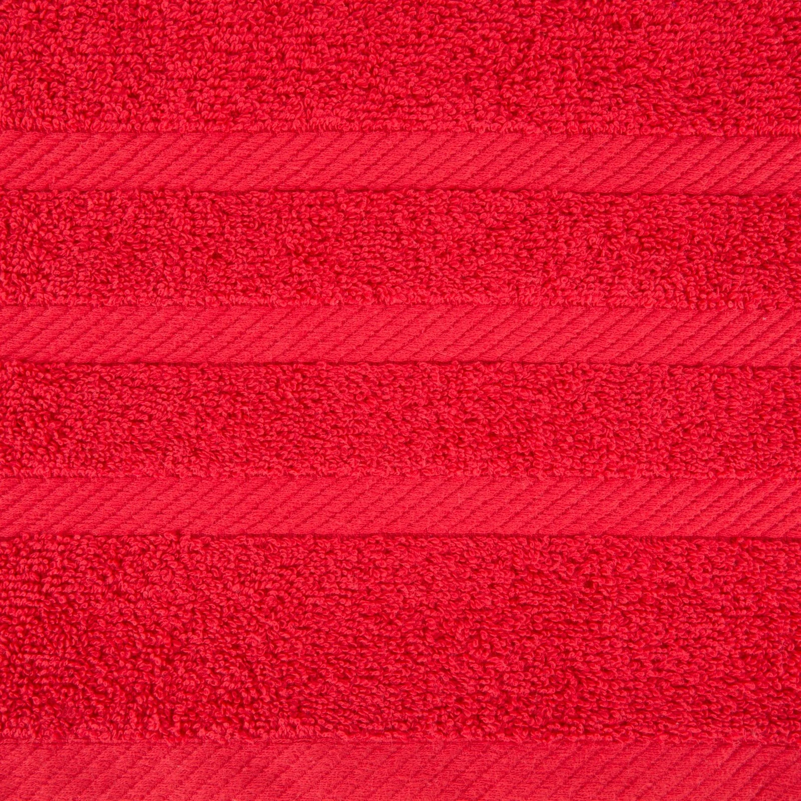 Jednobarwny ręcznik z miękkiej i chłonnej tkaniny bawełnianej o splocie frotte zdobiony kolorową bordiurą w stylu fastrygi. Łatwy w praniu, nie farbuje. szerokość: 70 cm, długość: 140 cm, kolor: czerwony, Gramatura: 500 GSM, Skład: 100% bawełna