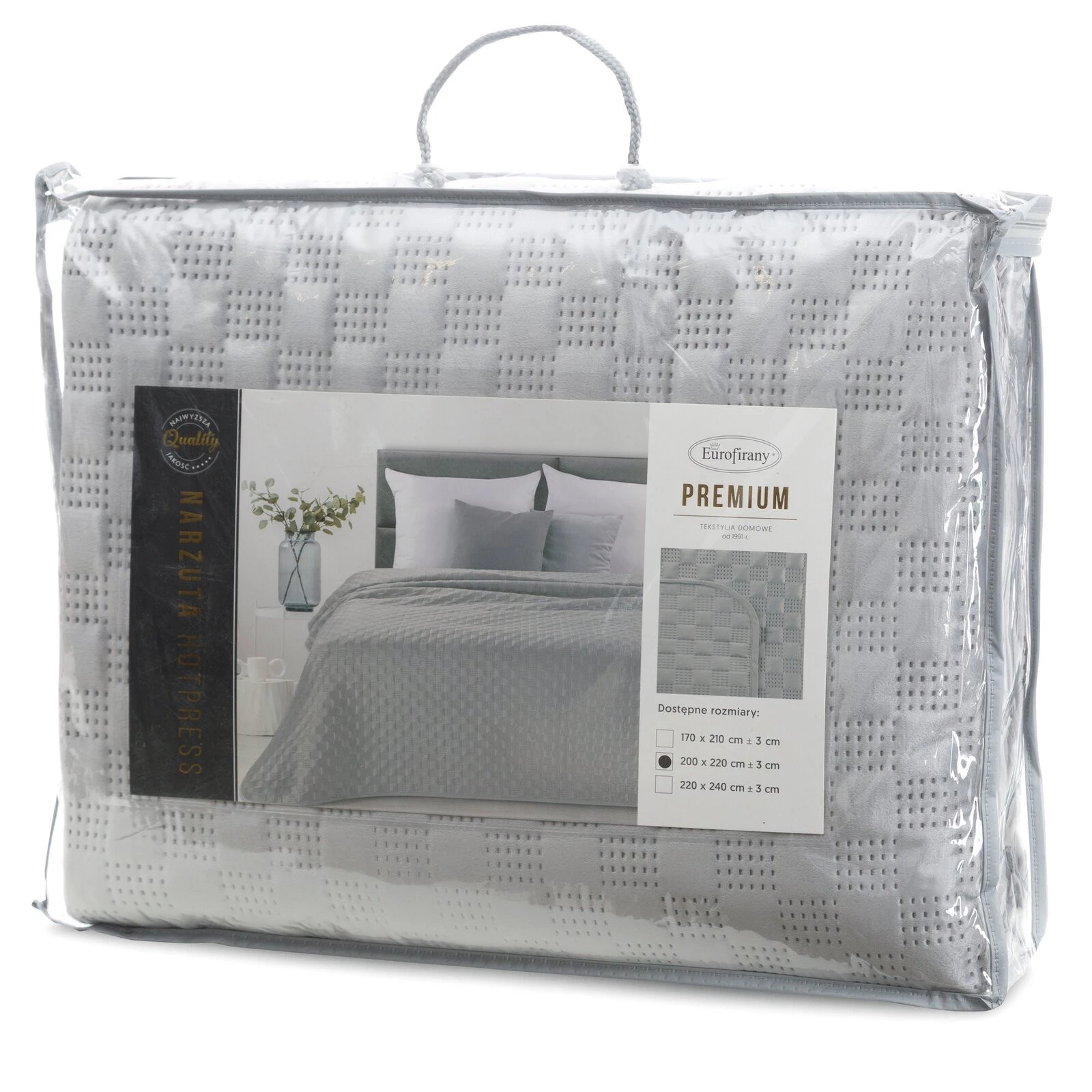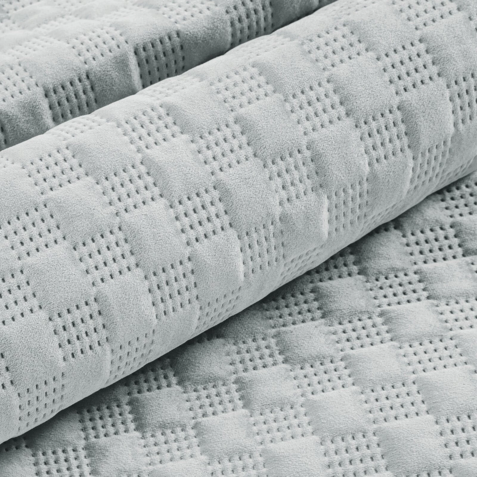 Ekskluzywna narzuta na łóżko z miękkiego i przyjemnego w dotyku welwetu pikowanego w dużą, gęstą jodełką. Do pikowania wykorzystano metodę bezszwową hotpress. szerokość: 220 cm, długość: 240 cm, kolor: srebrny, Gramatura: 250 GSM, Skład: 100% poliester