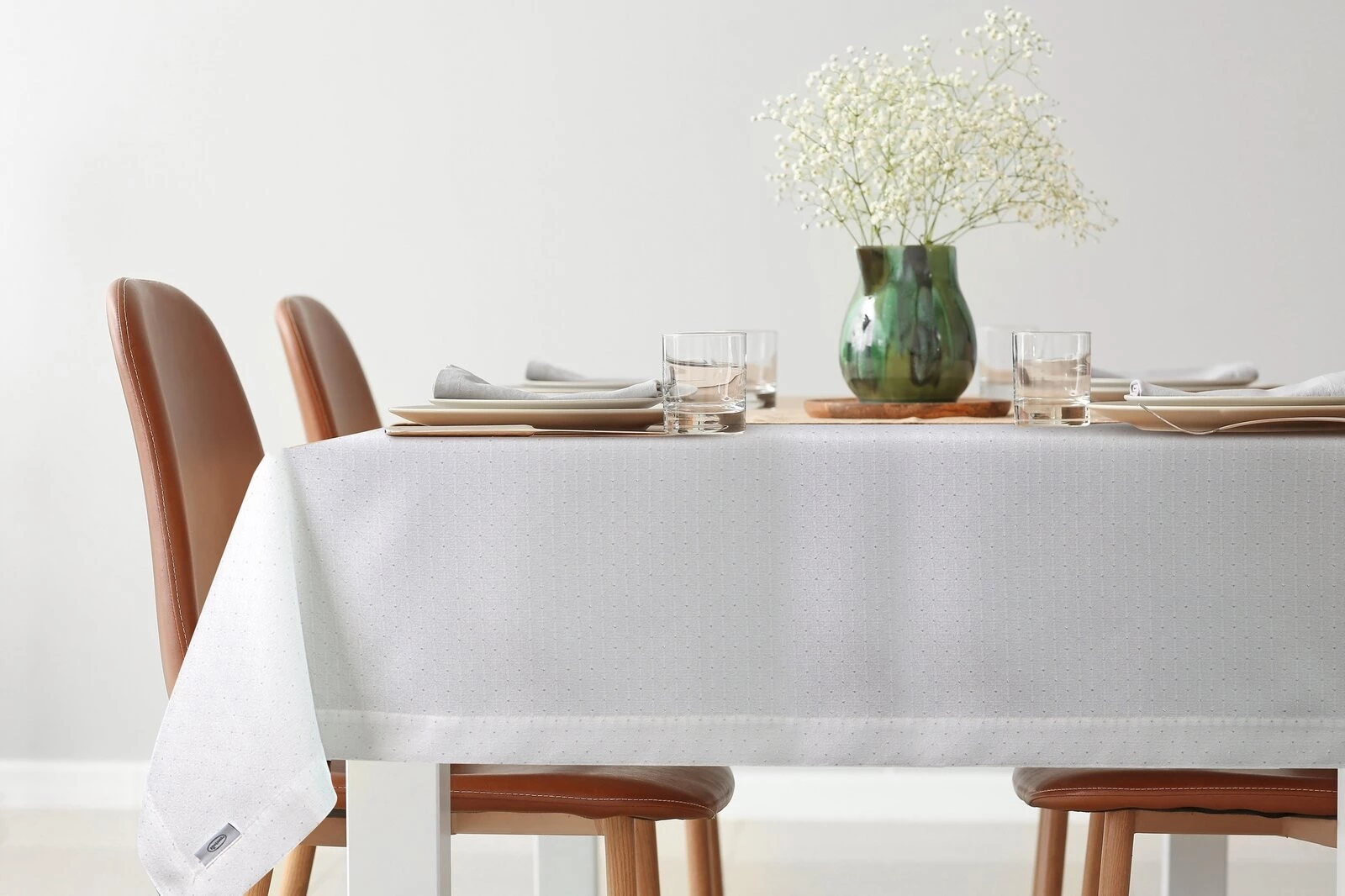 - Obrus zdobiony srebrną, błyszczącą nicią szerokość: 140 cm, długość: 220 cm, kolor: biały, Gramatura: 160 GSM, Skład: 100% poliester