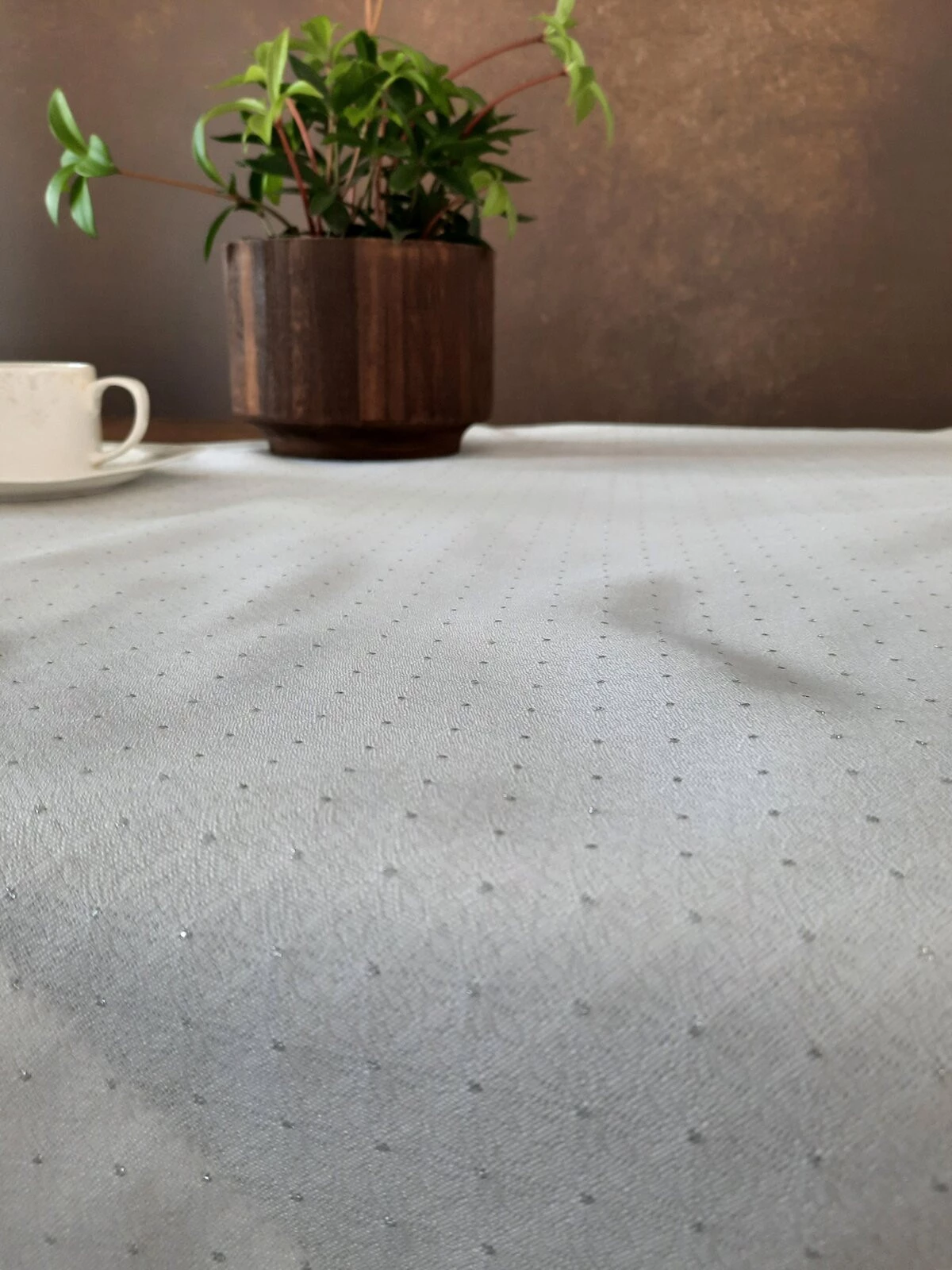 - Obrus zdobiony srebrną, błyszczącą nicią szerokość: 145 cm, długość: 280 cm, kolor: biały, Gramatura: 160 GSM, Skład: 100% poliester