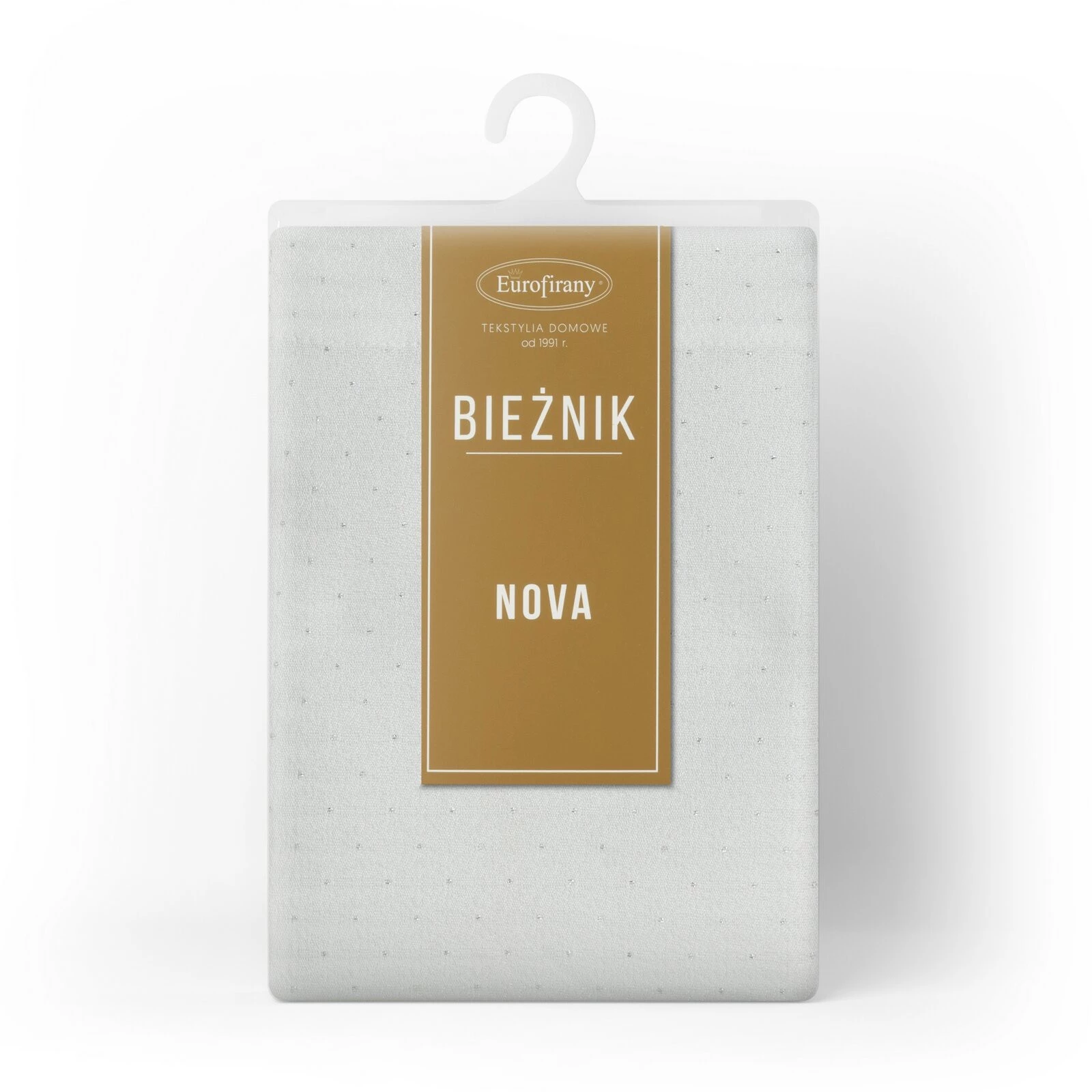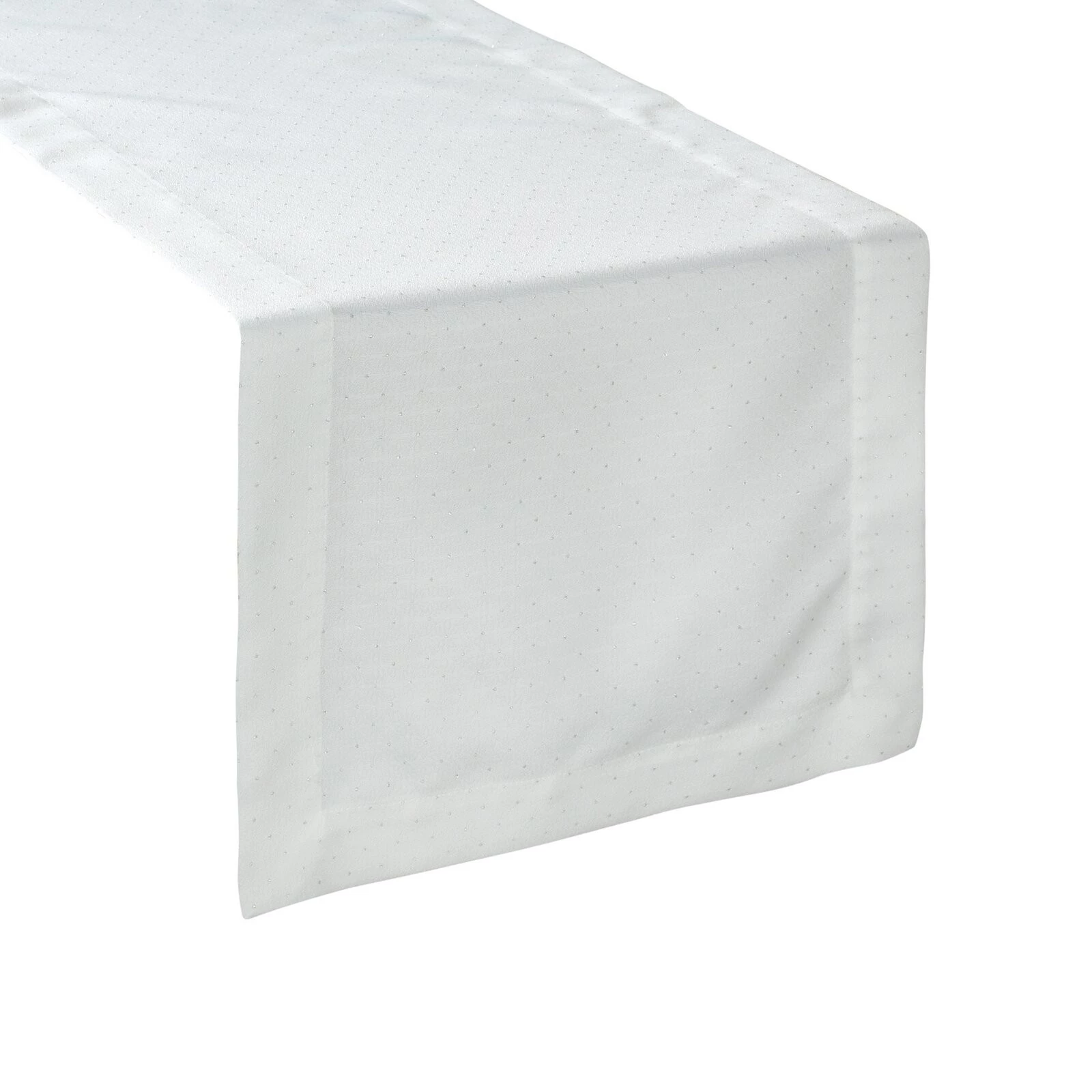 - Bieżnik zdobiony srebrną, błyszczącą nicią szerokość: 40 cm, długość: 180 cm, kolor: biały, Gramatura: 160 GSM, Skład: 100% poliester