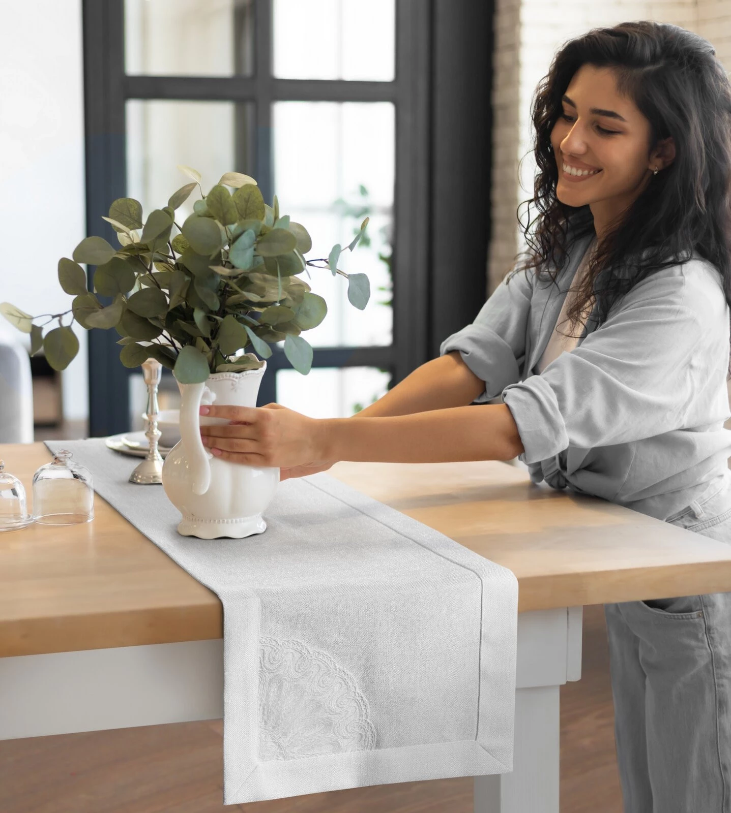 - Ekskluzywna serweta dekoracyjna z delikatnym zdobieniem szerokość: 85 cm, długość: 85 cm, kolor: biały, Gramatura: 280 GSM, Skład: 100% poliester