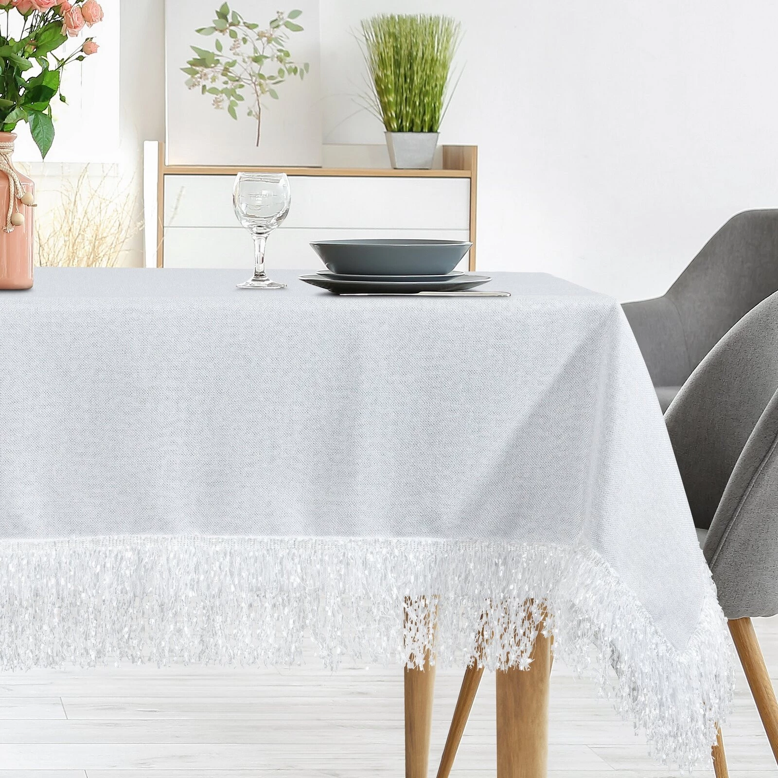 - Ekskluzywny gładki obrus z dekoracyjną taśmą z frędzelkami szerokość: 140 cm, długość: 180 cm, kolor: biały, Gramatura: 280 GSM, Skład: 100% poliester