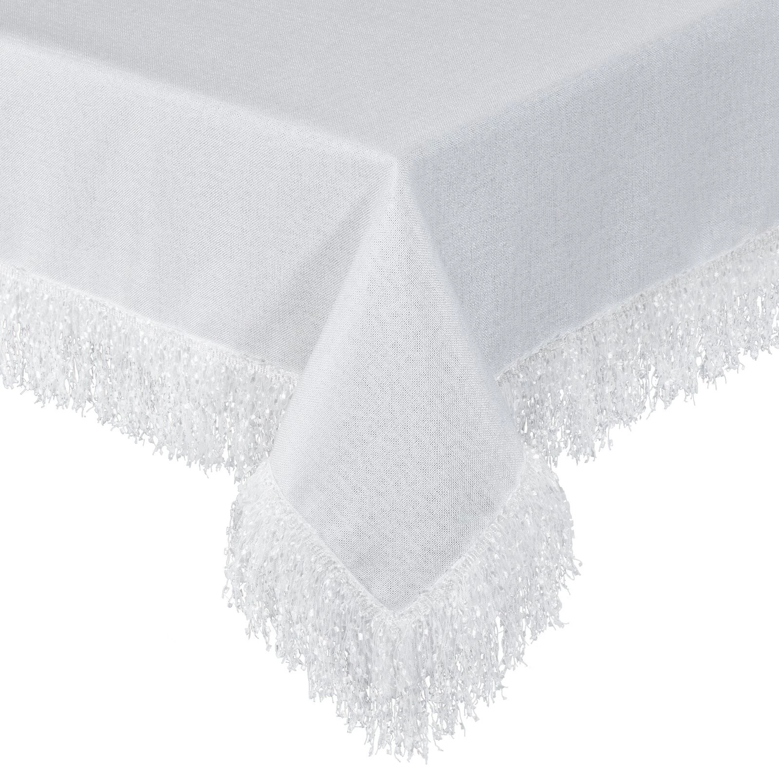 Ekskluzywny gładki obrus z dekoracyjną taśmą z frędzelkami szerokość: 140 cm, długość: 220 cm, kolor: biały, Gramatura: 280 GSM, Skład: 100% poliester