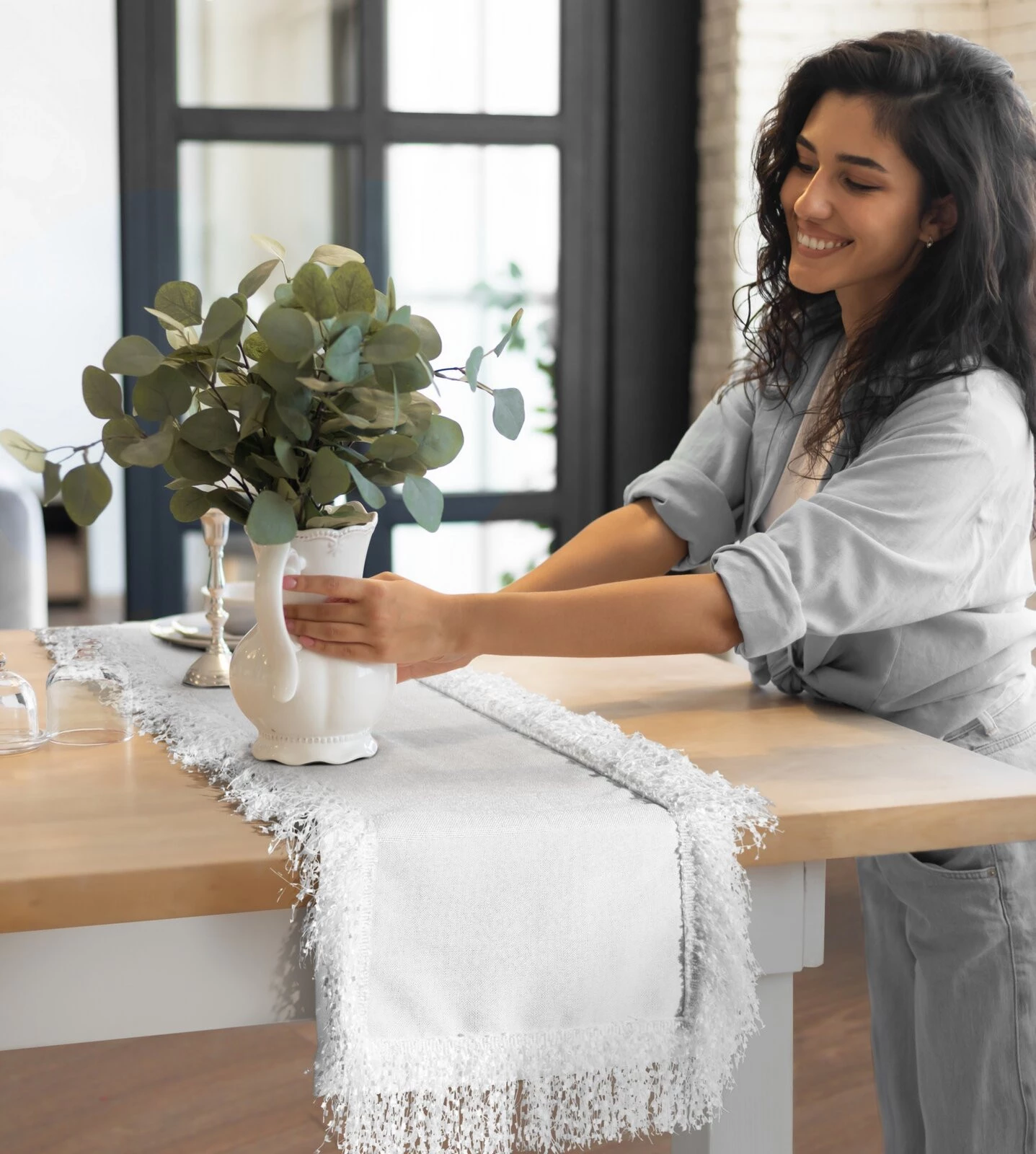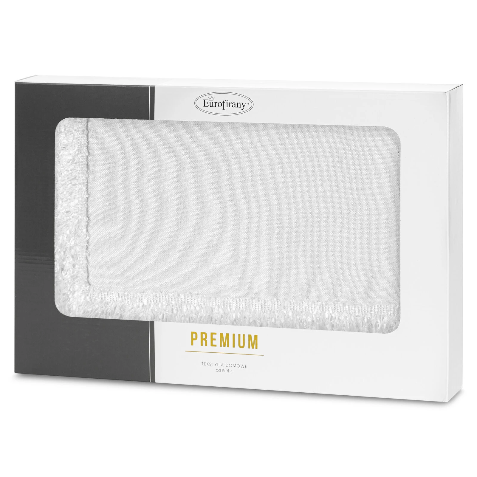 - Ekskluzywny gładki obrus z dekoracyjną taśmą z frędzelkami szerokość: 140 cm, długość: 260 cm, kolor: biały, Gramatura: 280 GSM, Skład: 100% poliester