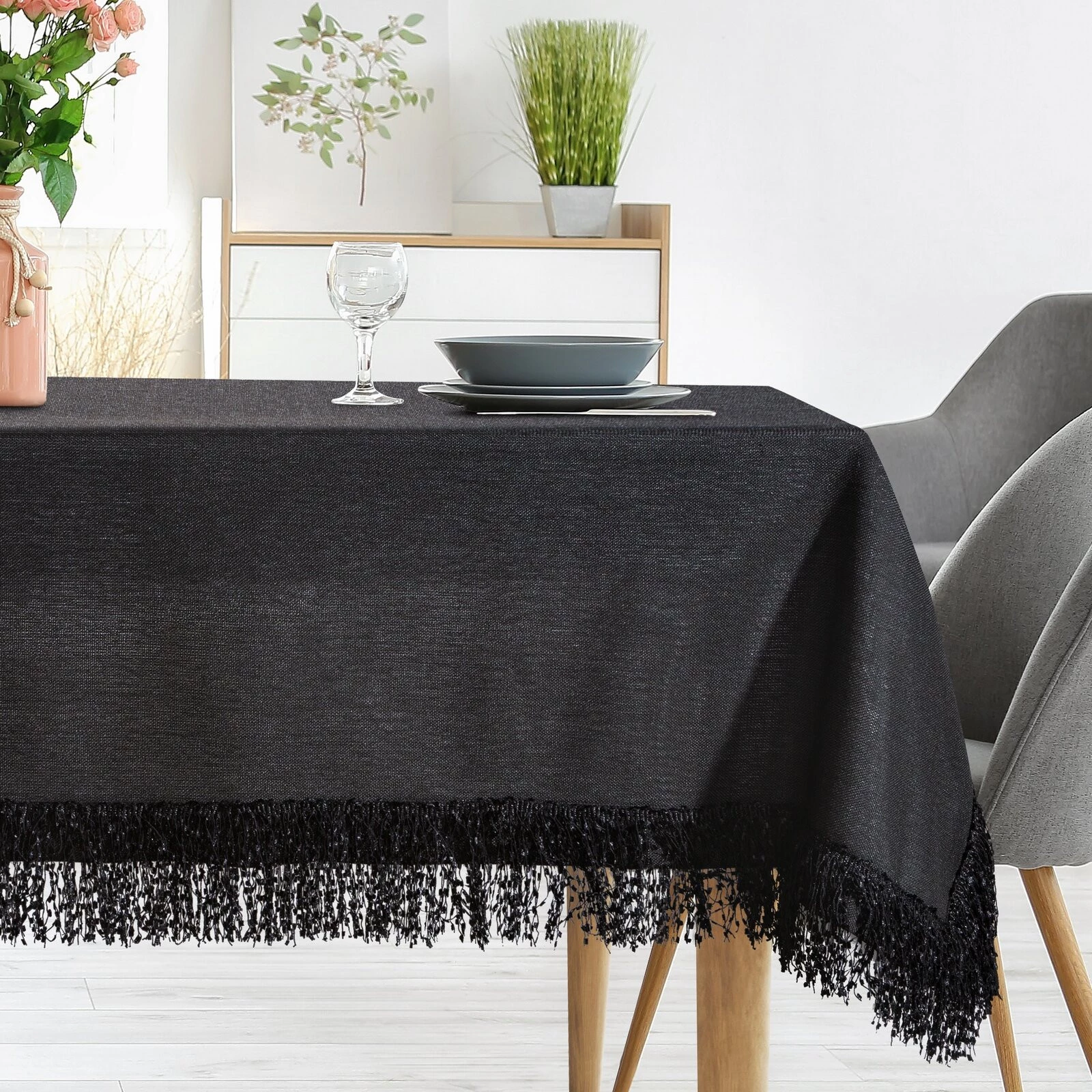 - Ekskluzywny gładki obrus z dekoracyjną taśmą z frędzelkami szerokość: 140 cm, długość: 260 cm, kolor: czarny, Gramatura: 255 GSM, Skład: 100% poliester