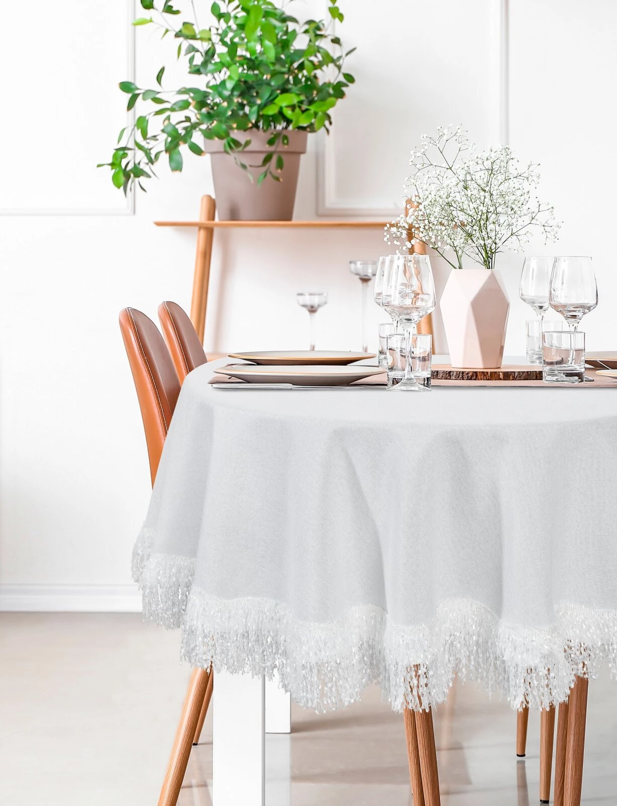 Ekskluzywny gładki okragły obrus z dekoracyjną taśmą z frędzelkami kolor: biały, Gramatura: 280 GSM, Skład: 100% poliester