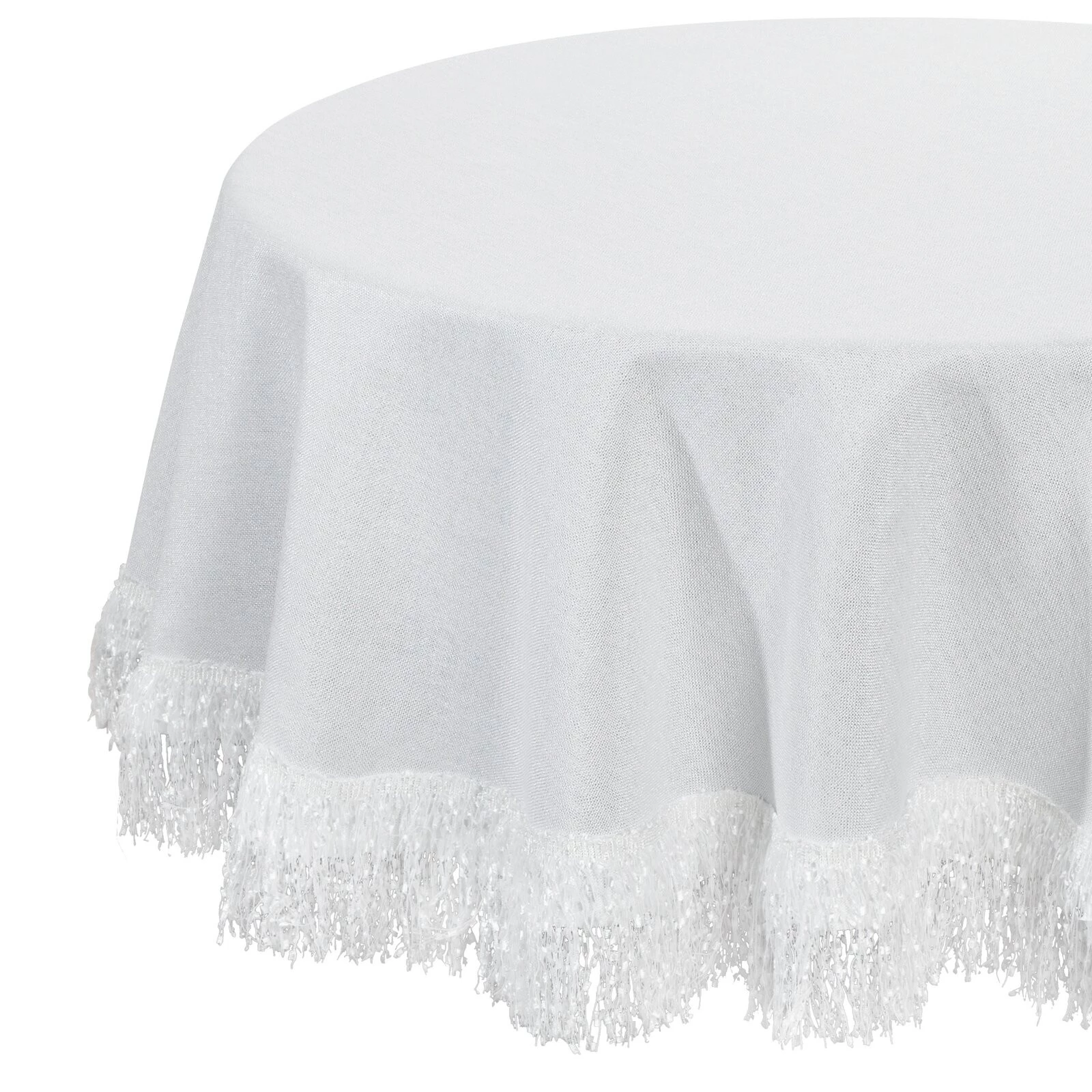 Ekskluzywny gładki okragły obrus z dekoracyjną taśmą z frędzelkami kolor: biały, Gramatura: 280 GSM, Skład: 100% poliester