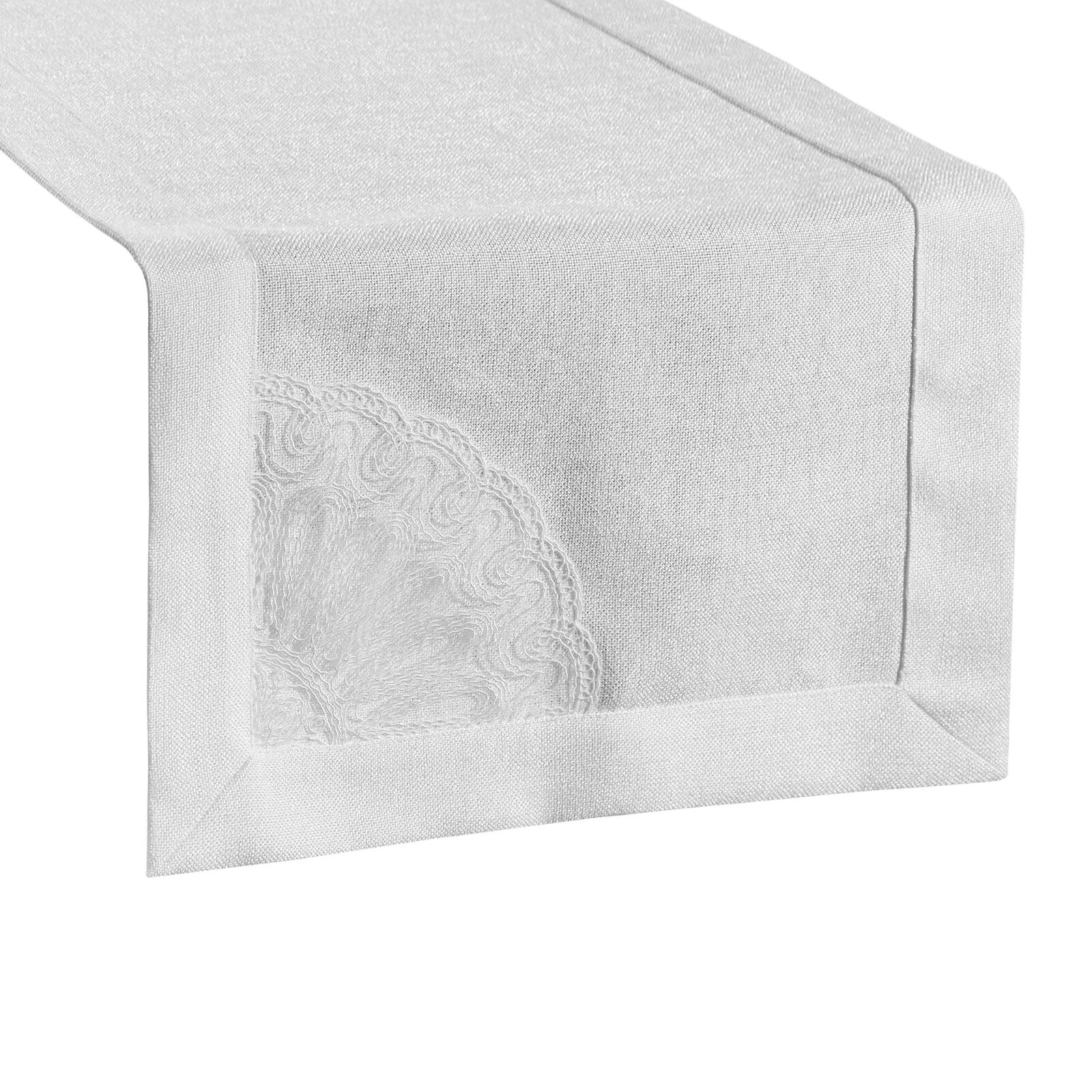 Ekskluzywny bieżnik dekoracyjny z delikatnym zdobieniem szerokość: 40 cm, długość: 140 cm, kolor: biały, Gramatura: 280 GSM, Skład: 100% poliester