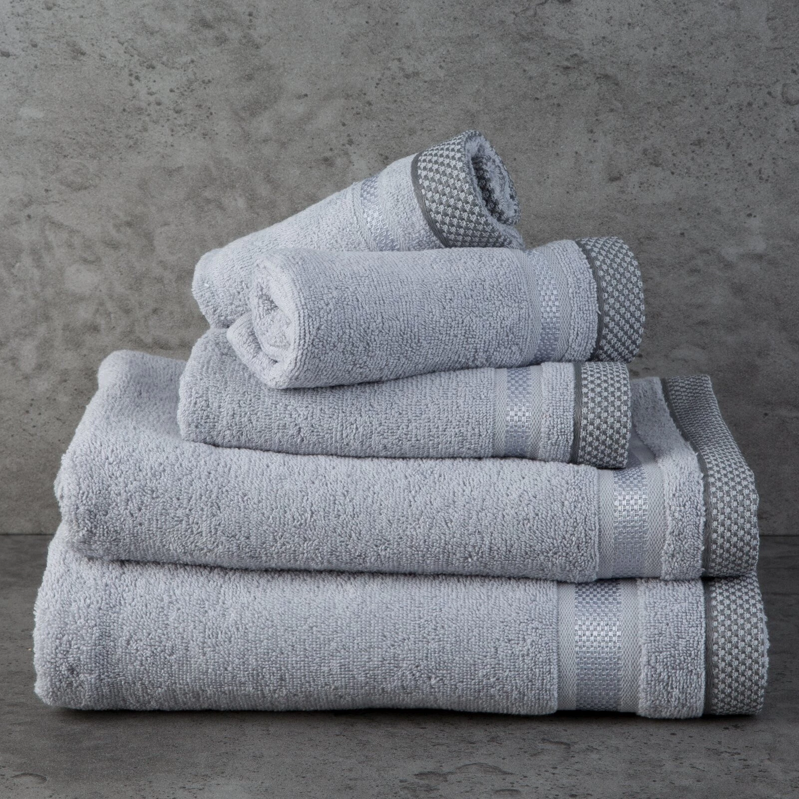 Jednobarwny ręcznik z miękkiej i chłonnej tkaniny bawełnianej o splocie frotte zdobiony kolorową bordiurą w stylu fastrygi. Łatwy w praniu, nie farbuje. szerokość: 30 cm, długość: 50 cm, kolor: jasnoszary, Gramatura: 500 GSM, Skład: 100% bawełna; część ozdobna: 75% poliester, 25% wiskoza