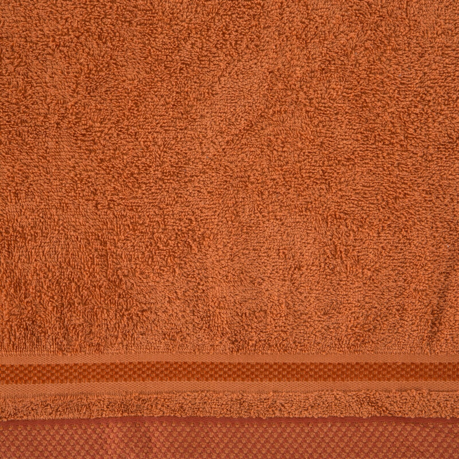 Jednobarwny ręcznik z miękkiej i chłonnej tkaniny bawełnianej o splocie frotte zdobiony kolorową bordiurą w stylu fastrygi. Łatwy w praniu, nie farbuje. szerokość: 50 cm, długość: 90 cm, kolor: pomarańczowy, Gramatura: 500 GSM, Skład: 100% bawełna; częsc ozdobna: 75% poliester, 25% wiskoza