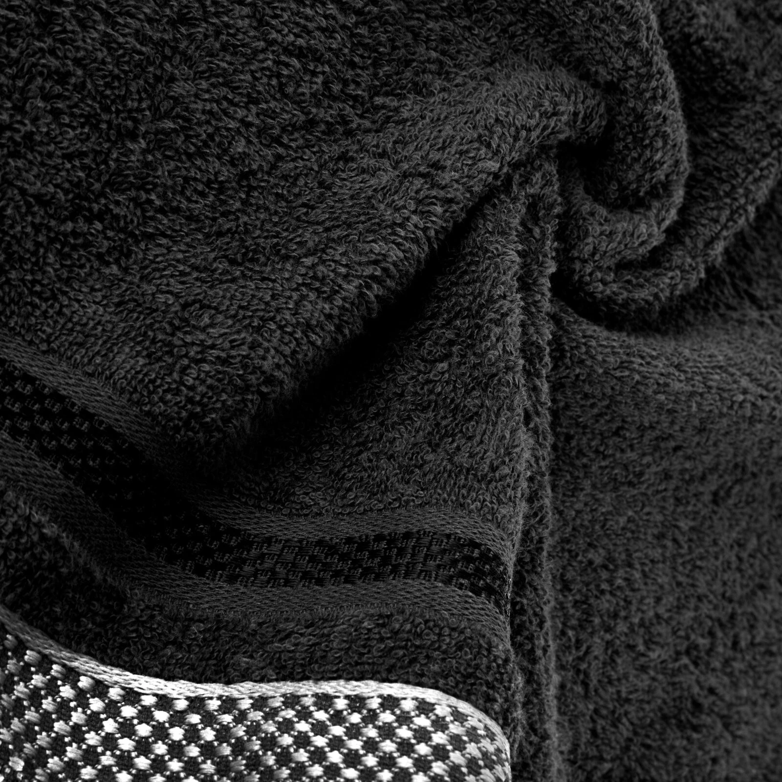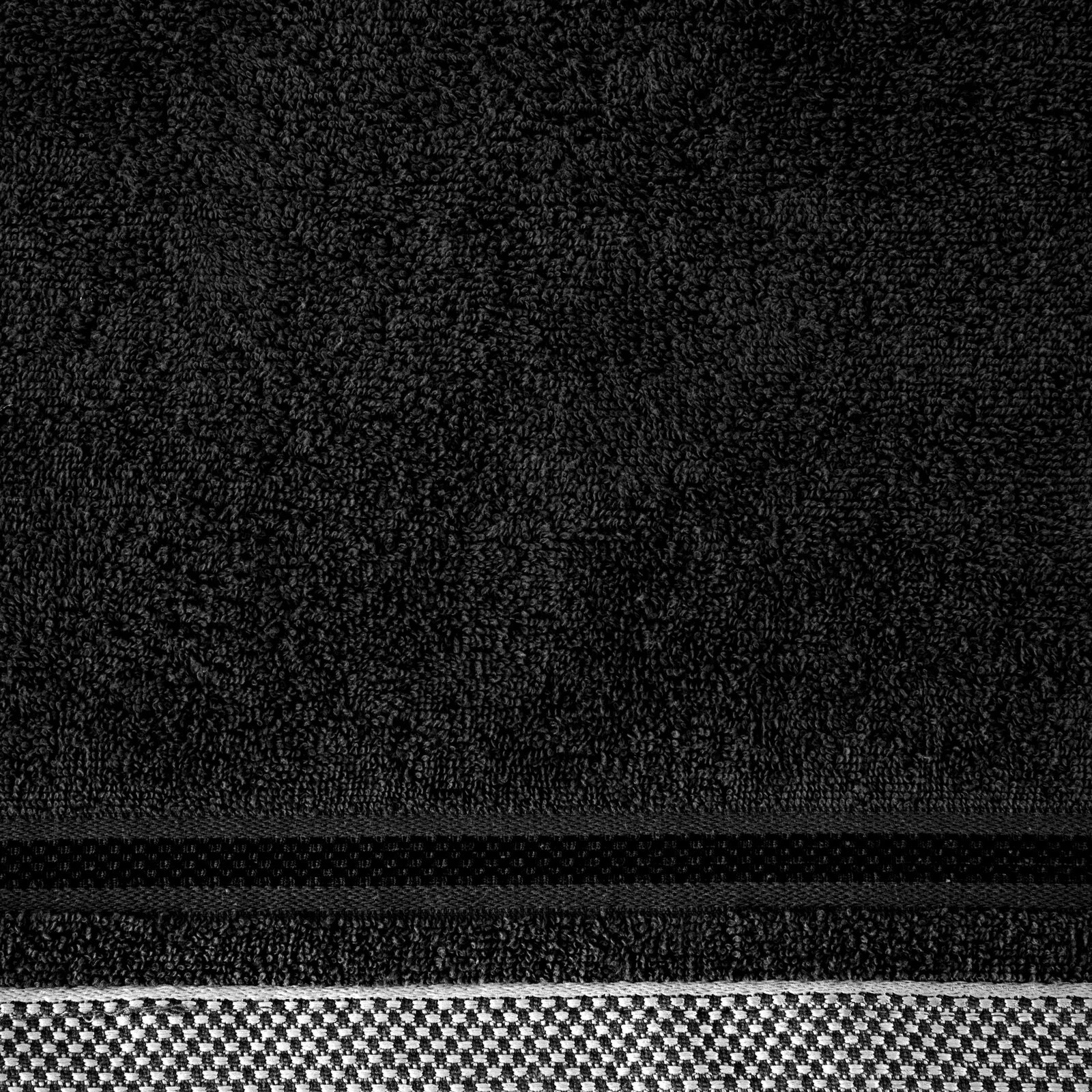 Jednobarwny ręcznik z miękkiej i chłonnej tkaniny bawełnianej o splocie frotte zdobiony kolorową bordiurą w stylu fastrygi. Łatwy w praniu, nie farbuje. szerokość: 70 cm, długość: 140 cm, kolor: czarny, Gramatura: 500 GSM, Skład: 100% bawełna; część ozdobna: 75% poliester, 25% wiskoza
