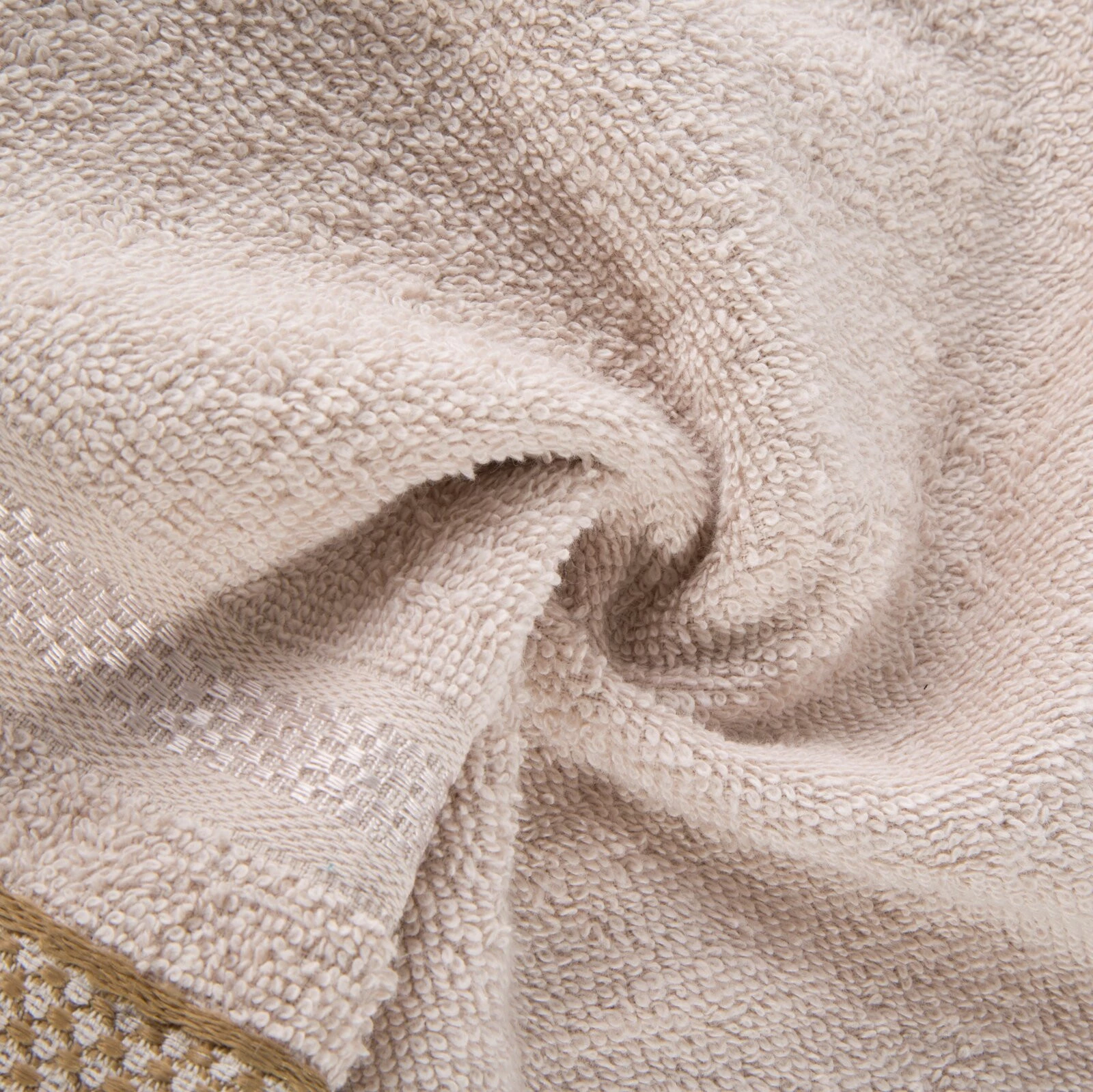 Jednobarwny ręcznik z miękkiej i chłonnej tkaniny bawełnianej o splocie frotte zdobiony kolorową bordiurą w stylu fastrygi. Łatwy w praniu, nie farbuje. szerokość: 30 cm, długość: 50 cm, kolor: beżowy, Gramatura: 500 GSM, Skład: 100% bawełna; część ozdobna: 75% poliester, 25% wiskoza