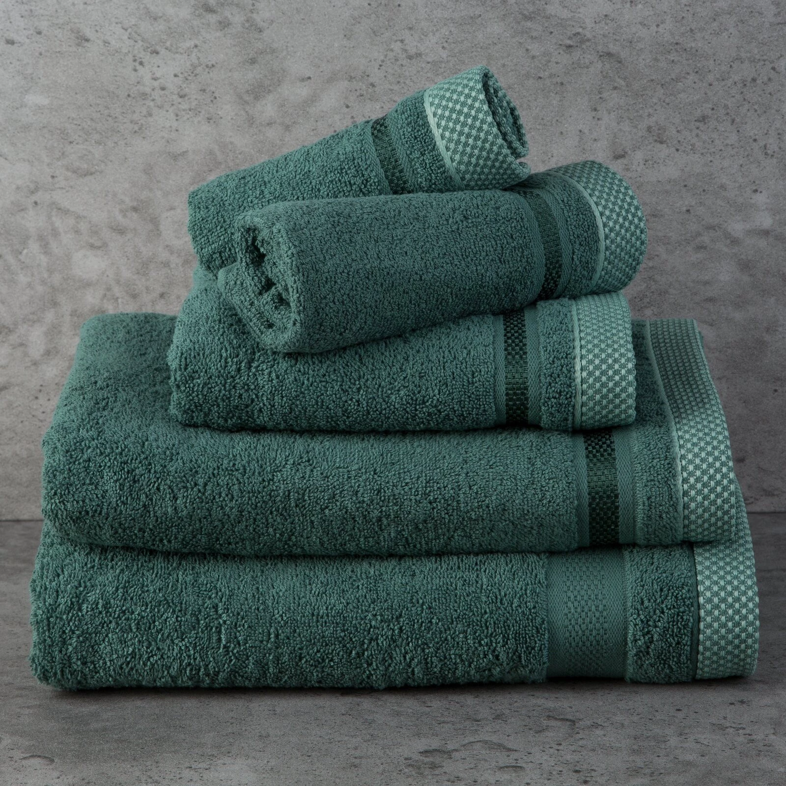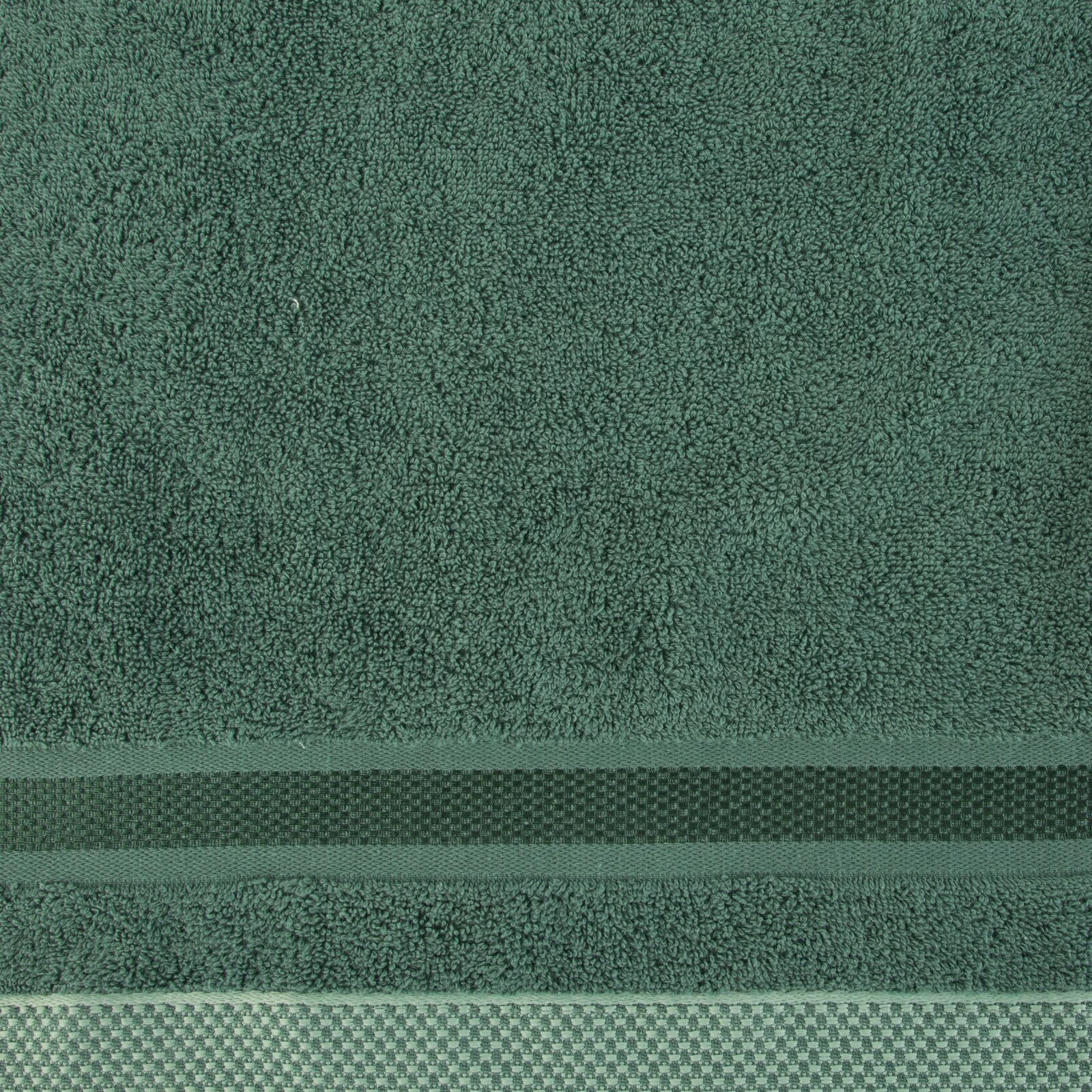 Jednobarwny ręcznik z miękkiej i chłonnej tkaniny bawełnianej o splocie frotte zdobiony kolorową bordiurą w stylu fastrygi. Łatwy w praniu, nie farbuje. szerokość: 40 cm, długość: 60 cm, kolor: ciemnozielony, Gramatura: 500 GSM, Skład: 100% bawełna; część ozdobna: 75% poliester, 25% wiskoza
